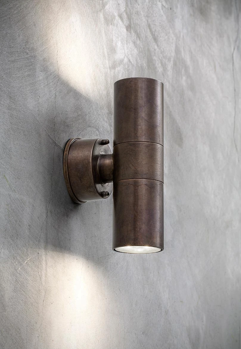 Très jolie petite applique contemporaine Abarth, avec son cylindre vertical dans lequel sont encastré 2 modules LED qui permettent une lumière vers le haut et vers le bas. Le tube fixé sur un petit support mural circulaire, et l’ensemble est réalisé en laiton vieilli selon un procédé manuel qui accélère l’oxydation naturelle du métal. La finition donne une patine particulière, l’applique s’intègre parfaitement dans votre jardin ou terrasse et grâce à sa protection IP65 elle est dotée d’une grande résistance aux intempéries, en faisant un modèle d’extérieur idéal. La maison italienne Aldo Bernardi s’inspire de techniques artisanales de la région d’Aloso pour développer des luminaires d’excellente qualité.
