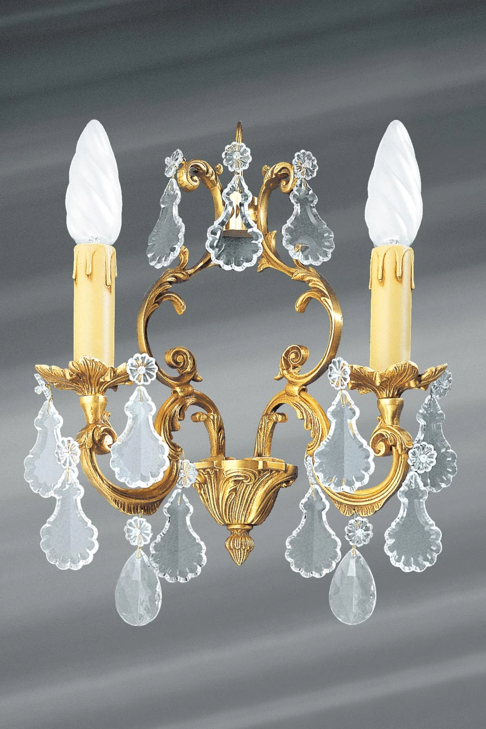 Magnifiquement travaillée, cette délicate applique murale Louis XV en cristal de bohème et bronze massif patiné vieil or est conçue pour une intégration parfaite dans les environnements décoratifs de la plus grande exactitude stylistique. Deux bras en double volute, finement sculptés et décorés de motifs en feuille d’acanthe repliées, s’écartent d’une partie centrale inférieure (le culot) décorée d’un motif assorti. Ces branches, d’un parfait équilibre, soutiennent chacune à leur extrémité un bougeoir. Les bassins (coupelles situées à la base des bougeoirs) sont finement travaillés en feuille d’acanthe. Dans un mouvement particulièrement gracieux, chacune des deux branches de cette applique est reliée à un élément en double volute également sculpté et orné. Ces deux éléments se rejoignent à la partie supérieure de l’applique. De nombreuses pampilles en cristal de bohème décorent cet ensemble. Elles sont taillées en poire, rosaces et feuilles. Avec un surplomb limité à 15cm, cette applique Louis XV peut être installée dans des pièces de circulation, sans gêner le passage. La fabrication est réalisée de façon exclusivement traditionnelle dans les ateliers français de ce fabricant d’exception.