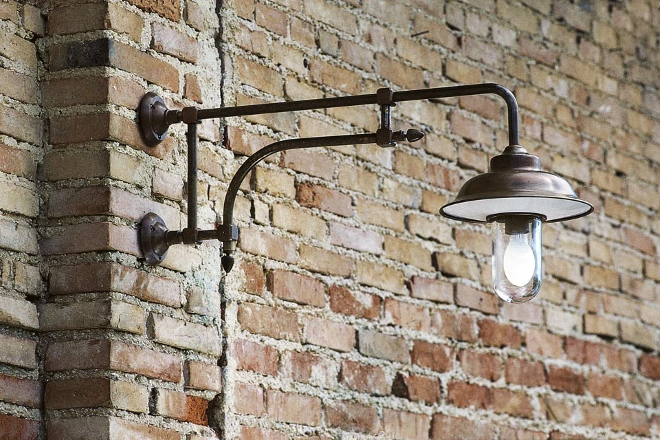 Cette magnifique applique d’extérieur en potence à deux bras surprend par son dessin à la fois classique et original. Etanche, elle est conçue pour une installation à l’extérieur. Elle peut aussi être installée à l’intérieur, et, mesurant 84cm de long, elle est capable d’éclairer une table placée contre un mur. Le réflecteur est constitué d’une très belle pièce conique évasée en laiton patiné, à la base inférieure de laquelle un élément en aluminium émaillé blanc entoure le sommet de la verrerie transparente protégeant l’ampoule. La potence est formée d’un bras supérieur principal cintré à angle droit, et d’un bras courbe en étai apportant style et rigidité. La fabrication, d’une qualité hors normes, est menée dans les ateliers d’Aldo Bernardi, situés à Trévise en Italie. A voir aussi, l’applique référence 12120032 au style similaire munie d’une potence à trois bras.