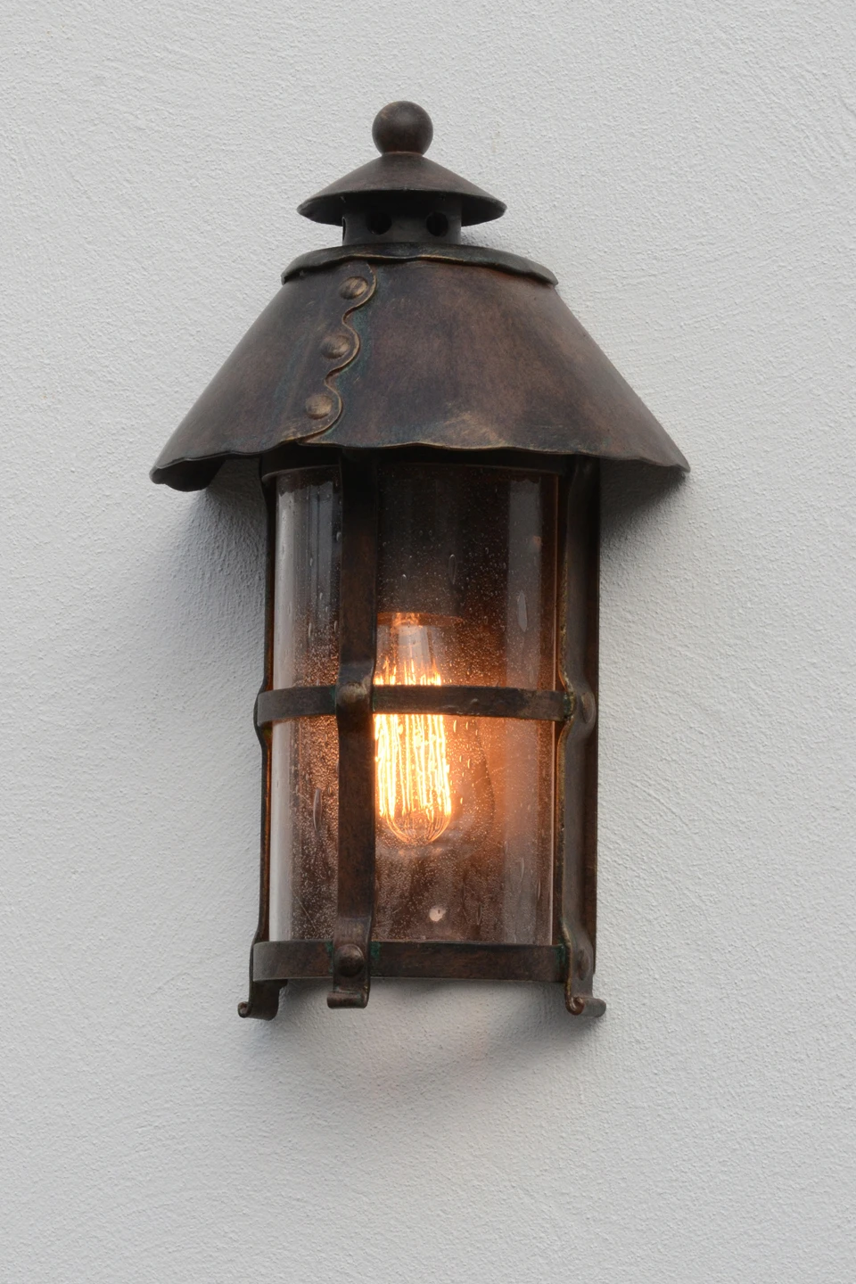 Une applique d’extérieur en fer forgé à la patine rouille avec un verre antique comme une demi-lanterne à chapeau conique. Le verre est protégé par une grille. Cette collection comprend également une autre applique visible sous la référence 12090072, un lustre référence 19010022 et une suspension référence 19010024. L’entreprise familiale allemande Robers développe des produits intemporels et de qualité depuis 1964. Réputée pour l’authenticité de ses produits fabriqués dans le respect des traditions artisanales, elle utilise des matériaux comme l’aluminium, le bronze ou encore la fonte, et propose une large gamme de finitions.