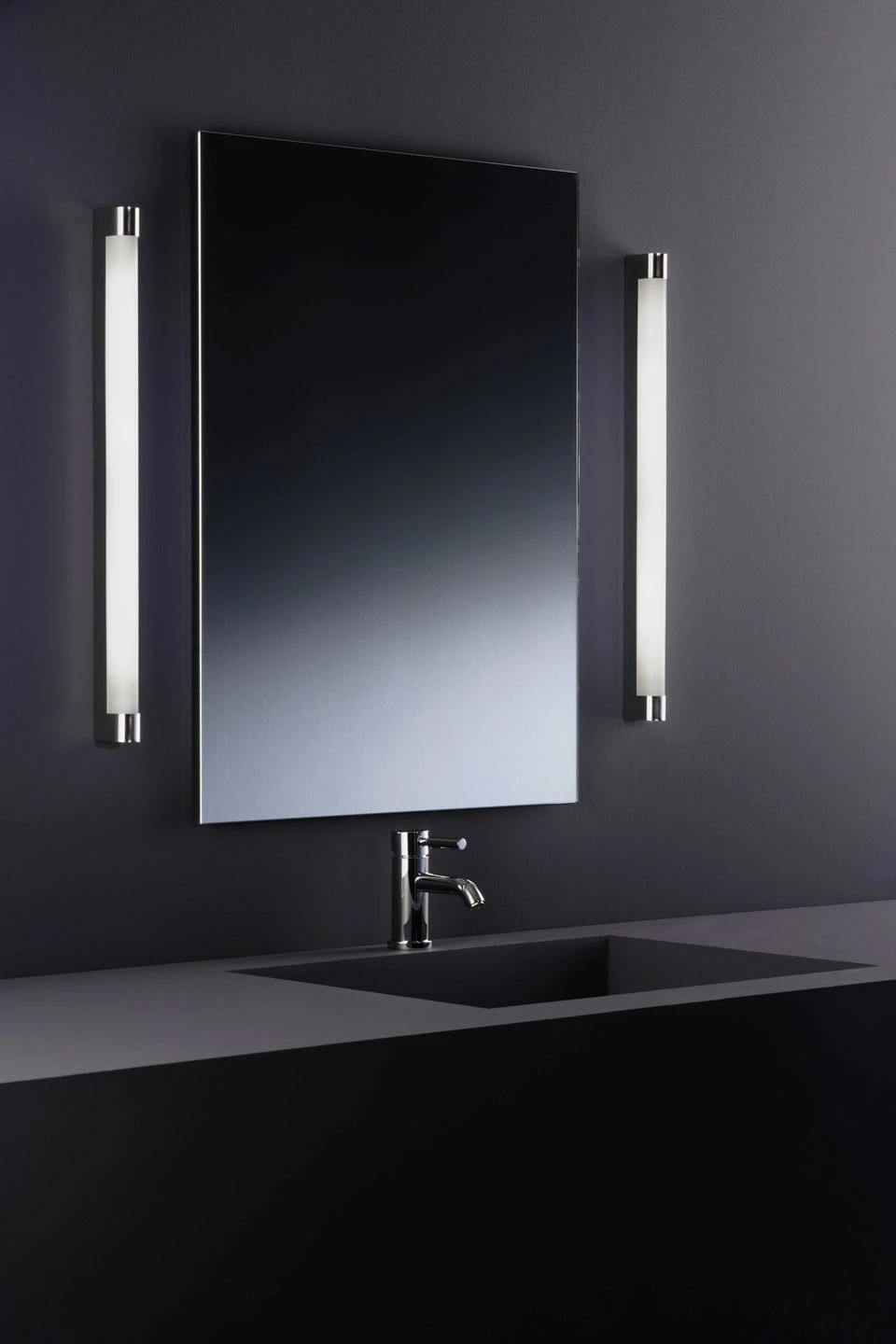 La qualité exceptionnelle des matériaux et de la fabrication de cette applique de salle de bain en tube et métal poli est garantie par le sérieux des ateliers allemands Baulmann et Leuchten qui la produise, fournisseurs de l’hôtellerie de luxe et spécialistes du luminaires d’intérieur de haute qualité depuis 75 ans. Le tube est enserré dans un support mural en inox poli. La puissance d’éclairage de son éclairage LED vous assure la perfection de l’éclairage, la mise en valeur de votre miroir et une image sans reflet. Garanti par la norme IP44, l’utilisation de ce luminaire vous offrira une sécurité absolue dans la pièce d’eau à laquelle vous le destinez. Cette applique est présentée ici installée verticalement sur le côté du miroir mais elle sera également du plus bel effet, installée horizontalement au dessus du miroir.