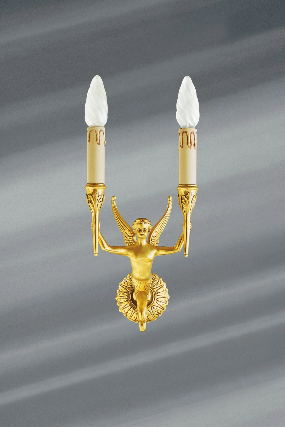 Charmante petite applique dorée 2 lumières en bronze qui reproduit à la perfection les dorures, l’angelot et la précision des décors en vieil or caractéristique de l’esthétique fastueuse de la Restauration. Le modèle est composé d’une structure en bronze, métal idéal par sa malléabilité, fait d’un angelot qui tient dans chacune de ses mains une des deux lumières du chandelier telles de grandes torches, dont la bobèche est décorée de petits motifs végétaux. Le support mural est un disque doré moulé de pétales qui donnent l’impression que l’ange jaillit du cœur d’une fleur.