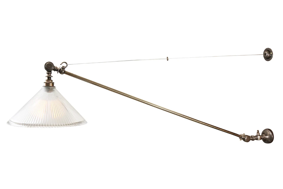 Ajustable, cette applique NYX en argent antique de style industriel est équipée d’un abat-jour conique en verre cannelé. Fine et discrète, elle s’ajuste à l’aide d’un câble fixé à un crochet au-dessus de l’abat-jour et au mur par un petit support en argent antique rond. Cette applique est articulée en deux points. Son abat-jour en verre prismatique peut s’incliner vers le haut ou vers le bas et son bras ramené vers le mur. Mike Treanor crée des luminaires intemporels, qui seront les pièces maîtresses de votre intérieur qu’il soit vintage, industriel ou contemporain. Ce luminaire existe également en laiton antique sous la référence 16050013.