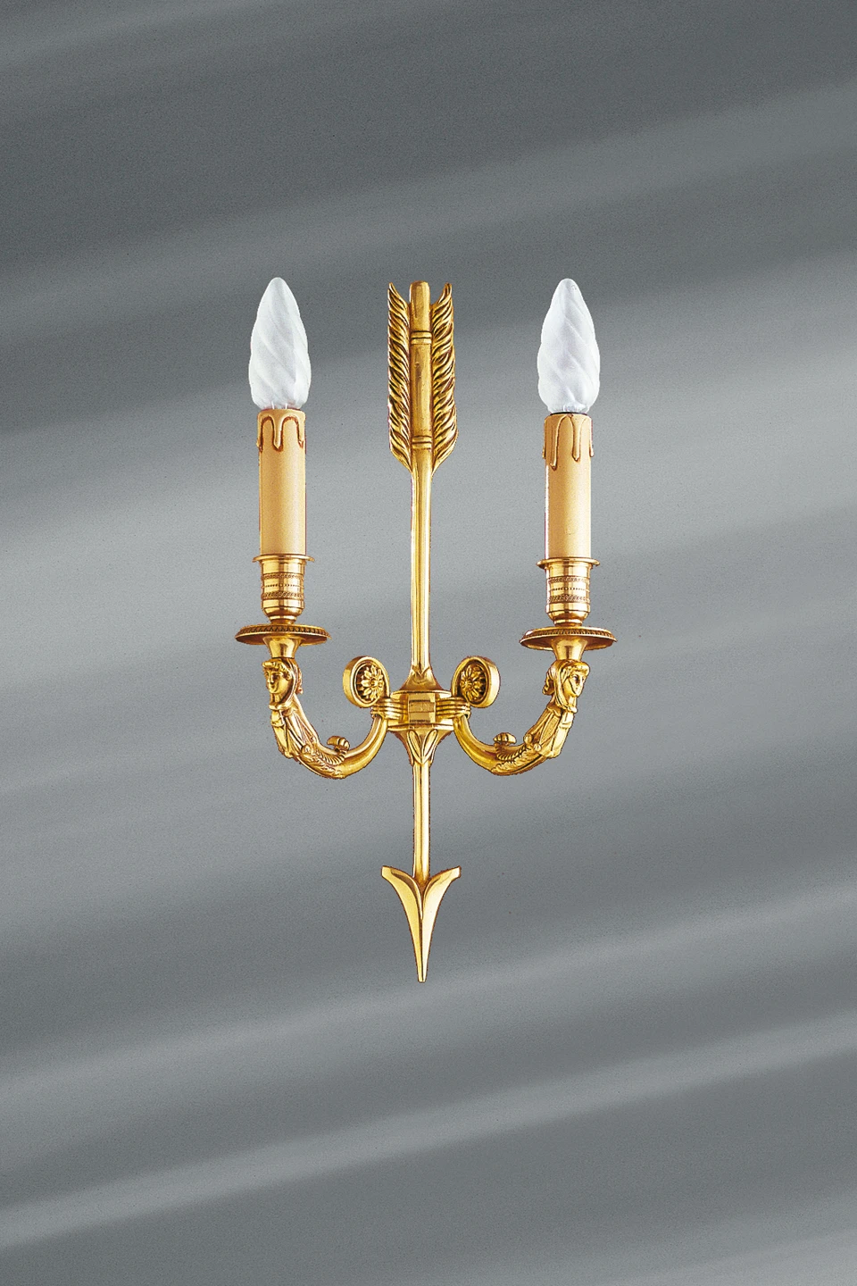 Cette applique en bronze massif de style Directoire reprend en élément central, la flèche, symbole de la volonté et du prolongement de l’individu, cher à l’esprit révolution dont le style Directoire se fait l’écho. Merveilleusement exécutée, sa finition or vif lui donne force et éclat. Deux bustes de femmes coiffées du bonnet phrygien, autre symbole révolutionnaire ornent cette applique. Elles portent les bassins et bobèches et bien sur les deux lumières, un symbole de plus. La réalisation de cette applique est remarquable. La qualité du travail de son décor est exceptionnelle. Elle a été rendue possible par le savoir-faire des artisans d’art de la maison Lucien Gau qui se transmettent leur savoir depuis six générations. Qualité exceptionnelle qui permis la consécration de cette entreprise comme Entreprise du Patrimoine Vivant Français.