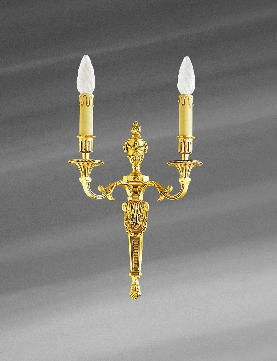 Dorée et patinée vieil or, fine et élégante, cette petite applique murale en bronze massif, de style Louis XVI, porte ses deux lumières avec grâce. Sa fabrication et son décor parfaitement travaillé sont assurés par les ateliers de la maison Lucien Gau, maître en la matière. Son dessin reprend les canons du style Louis XVI: drapés, festons et courbures pour les décors du sommet de l’applique et de sa base, alliés à la présence de feuilles, référence à la nature et à la présence de formes géométriques rappelant les thèmes antiques pour la forme du pied, les base des bobèches ainsi que celle du sommet du décor. Sa petite taille permet de la placer dans des couloirs ou des entrées de dimension classique, la qualité de son exécution en fait un objet d’art remarquable. Elle existe cependant dans des dimensions supérieures: en trois lumières sous les références 16060029 et 16060031 et en cinq lumières sous la référence 16060028.
