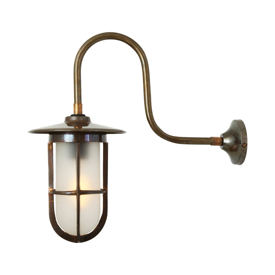 Fabo est une applique d’extérieur qui allie style marine et élégance, avec son abat-jour en lanterne, son bulbe de verre givré protégé par une grille, et son bras en col de cygne. Le socle est une discrète pièce circulaire, et l’ensemble est en laiton travaillé pour donner une belle finition antique. Ce modèle, grâce à sa classe IP65, est destinée à être posé en extérieur, et illuminera votre jardin d’une lumière chaude. La maison Mullan propose une vaste gamme de luminaires intemporels d’intérieur et extérieur, de style contemporain, industriel ou vintage, fabriqués en Irlande. Ce modèle existe en différentes finitions de laiton et de verre (18090049, 18090051, 18090052).