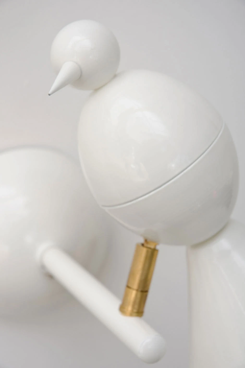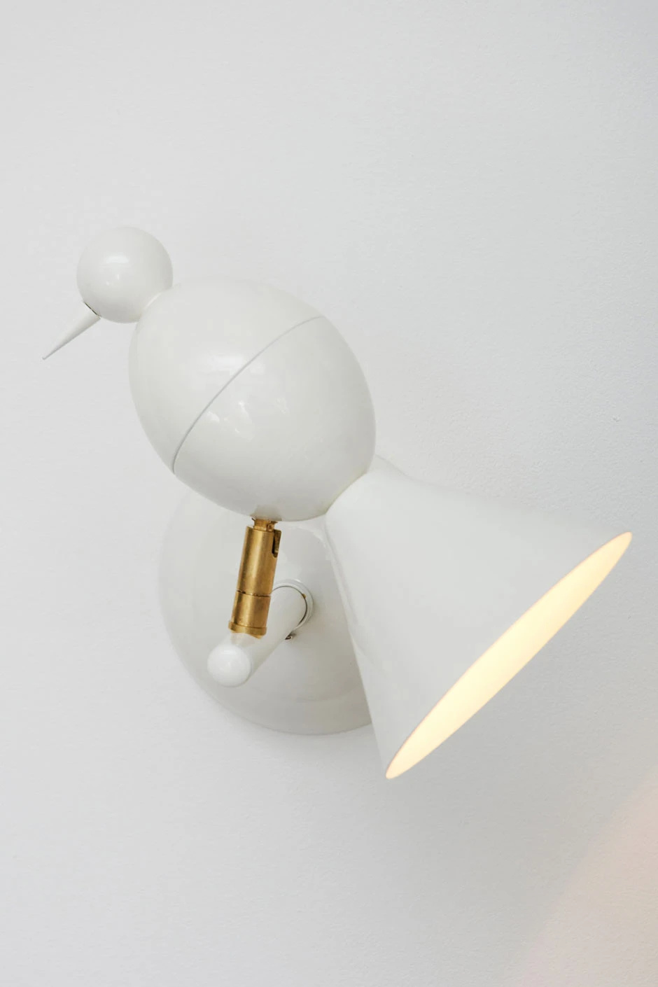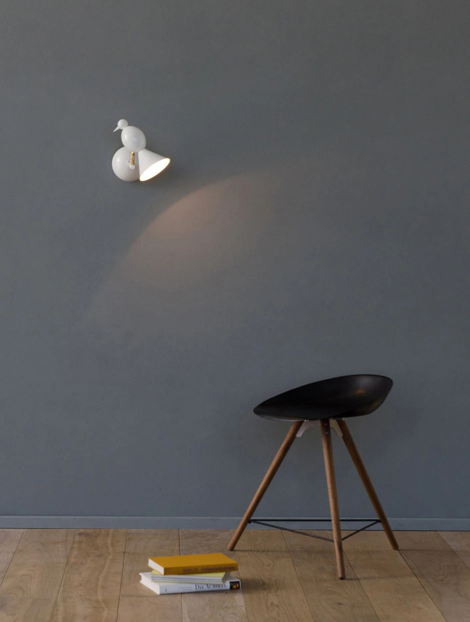 Cette très jolie applique murale blanche prend la forme d’une alouette stylisée. Elle est perchée au bout d’une tige reliée à un support mural de forme arrondie. L’alouette est orientable au moyen d’une rotule: on peut choisir la direction d’éclairage, mais aussi incliner l’oiseau dans la position la plus amusante ou poétique. Cette applique murale est équipée d’une ampoule spot halogène 230V, qui peut être commandée directement par un variateur standard si nécessaire. Très belle fabrication en métal laqué blanc, assemblage à la main. Design britannique et fabrication en Allemagne.
