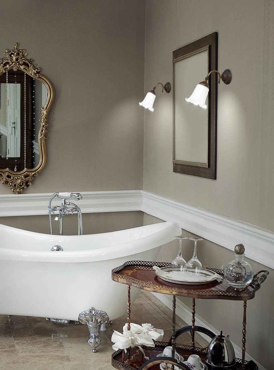 Dimensions: largeur 13cm, hauteur 21cm, profondeur de 19cm à 27cm selon l’orientation de la verrerie. Support mural diamètre 10cm. En cas d’installation dans une salle de bains, cette applique doit être installée à plus de 60cm de la baignoire ou de la douche (ce qui n’est pas le cas de la photographie d’ambiance présentée, qui ne constitue pas un guide d’installation).