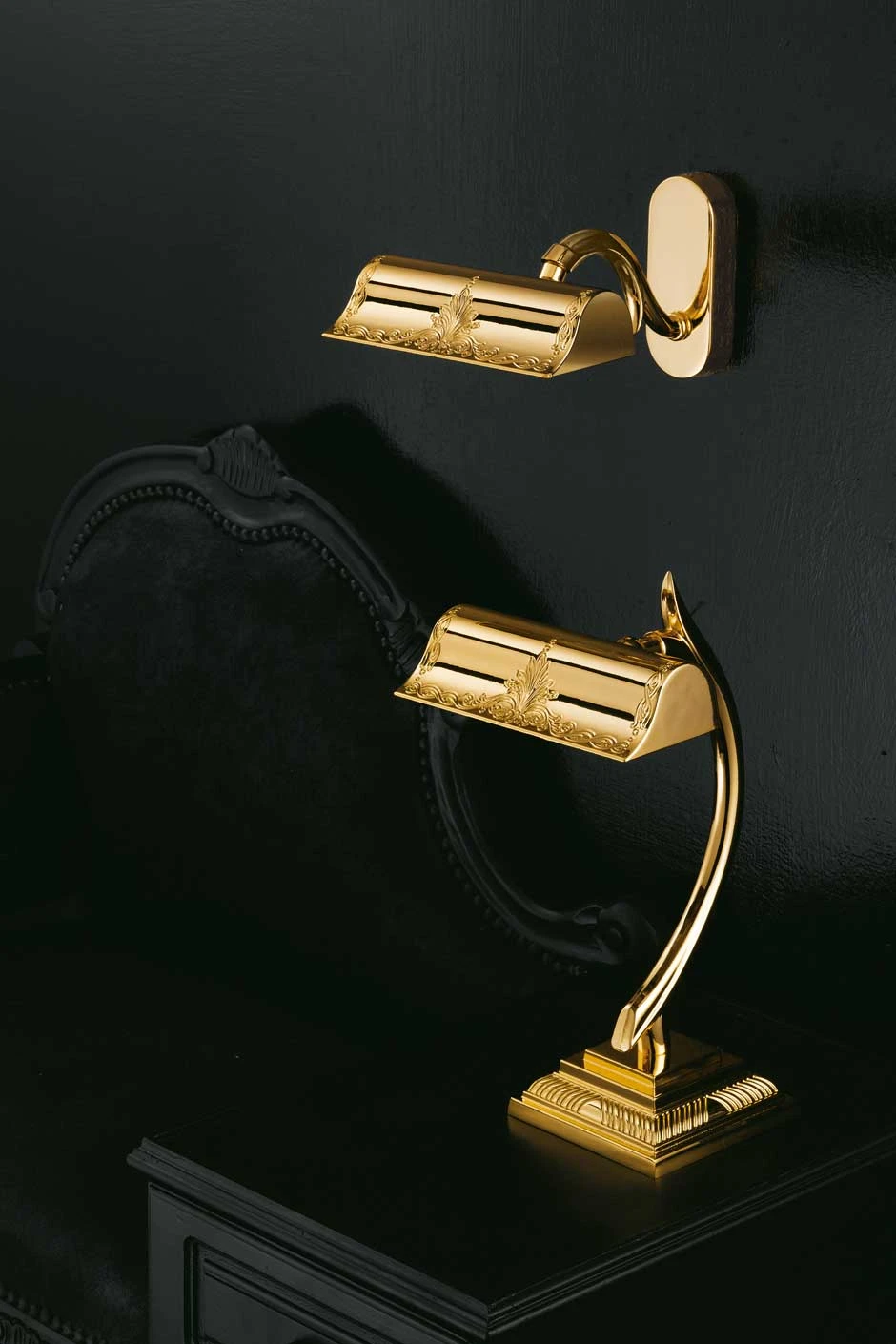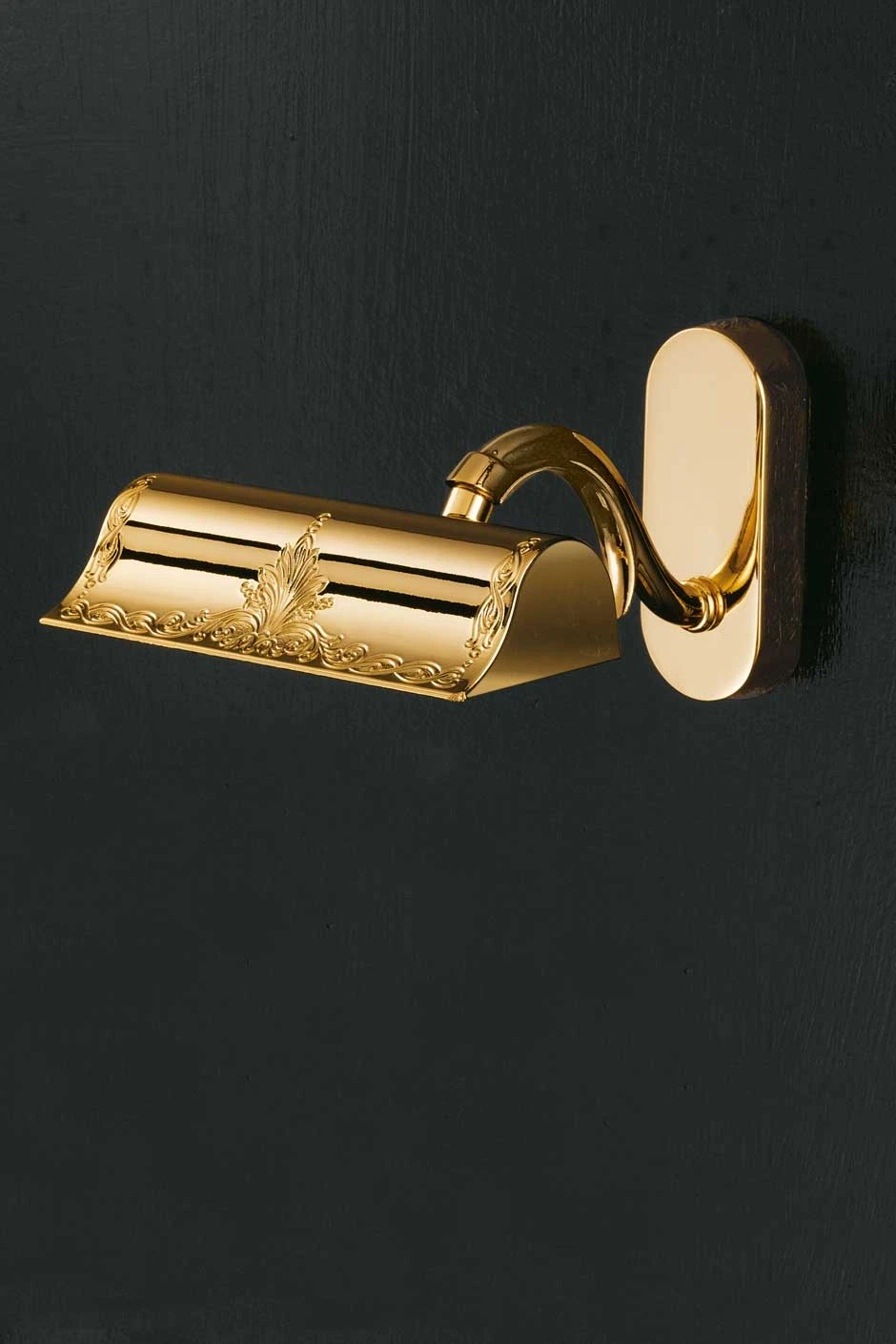 Cette très belle applique dorée est idéale en pour l’éclairage d’un tableau. Son très élégant bras en double volute associe classicisme des formes et un zeste de modernité grâce à son extrémité coupée. Le corps de cette applique est finement gravé d’un motif classique. Pour mieux comprendre le dessin du bras de cette applique, nous vous recommandons de visualiser la lampe à poser assortie référence 11110600. Equipée d’une ampoule halogène de 60W maximum, cette applique fournie un éclairage puissant.