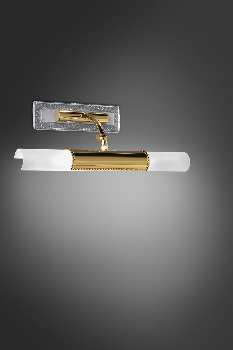 Joli mariage de verre et de métal pour cet éclairage pour tableau dans un style classique. Elle est composée d’un demi tube de verre satiné coupé dans la longueur, horizontal, dans un fourreau de métal moulé et doré poli, fixé par une petite tige courbe de métal doré également, sur une plaque de verre sculpté rectangulaire au mur. Le réflecteur est orientable grâce à une roture sur le bras courbe. L’ensemble est très élégant.