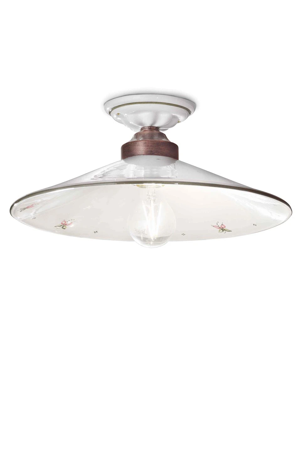 Joli plafonnier taille 35cm de la collection Asti disponible également en 20cm et 30cm, qui affirme un style rétro épuré avec son abat-jour en forme de coupelle évasée en céramique blanche sur une pièce de métal finition cuivre vieilli qui le relie au support de plafond moulé. L’abat-jour est doté d’un liseré vert sombre fin ainsi que d’un superbe motif floral fait de délicates touches de vert et rose, parsemant la céramique blanche, créant une ambiance campagne désuète. La maison Ferroluce produit exclusivement en Italie, et l’excellence de ses artisans céramiste qui livrent des luminaires intemporels depuis 1982 n’est plus à prouver.