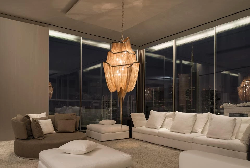 Sublime lustre Atlantis finition champagne, véritable sculpture de lumière démontrant la virtuosité des artisans italiens. Il se présente telle une cascade faite de centaines de chaines de nickel qui drapent la structure faite de trois anneaux de métal de forme irrégulière, conférant une irrésistible sensation de fluidité et de mouvement. Composée de presque 5km de chaines, le lustre Atlantis est équipé de 8 lumières dorées réhaussées par la finition champagne. Le lustre est suspendu sur une chaine en métal assorti et un discret cône de plafond rond.