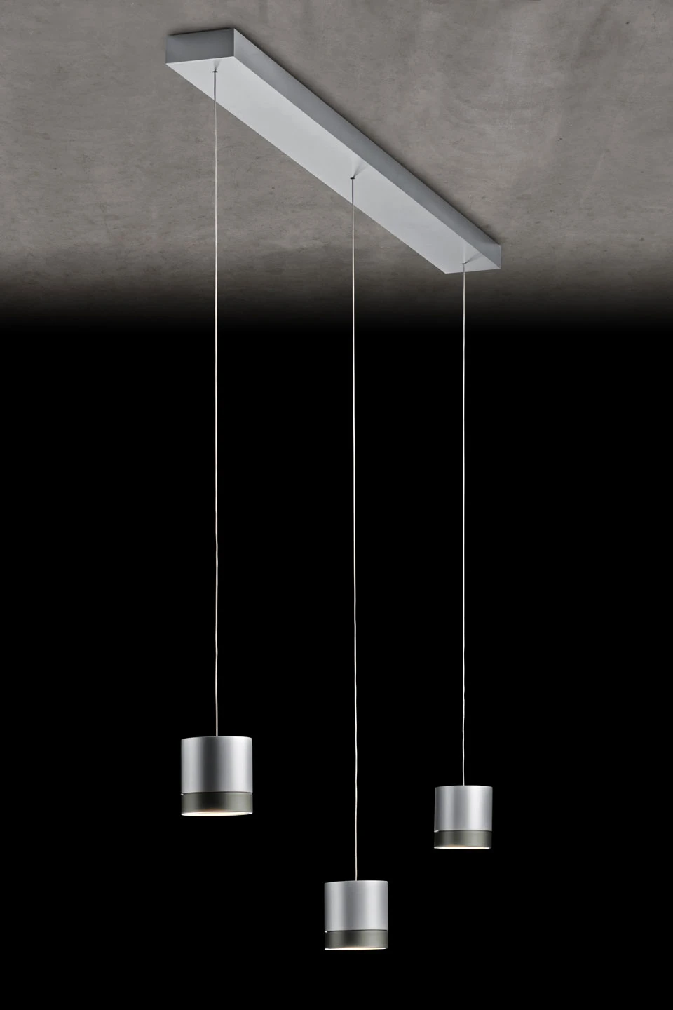 Aérienne est élégante, c’est la puissante suspension contemporaine Aura 3 lumières équipée d’éclairages LED intégrés avec 3 modules de 1660 lumens chacun indépendant pour chaque tête de lampe, en métal finition aluminium mat. Le modèle se compose d’un support de plafond rectangulaire tout en longueur, sur lequel sont fixés trois câbles métalliques fins reliés chacun à un cylindre en deux parties, une partie supérieure métallique finition aluminium mat et une partie inférieure plus fine qui correspond au réflecteur en finition aluminium mat. Notez la possibilité de les disposer à la même hauteur ou de manière asymétrique grâce à leur hauteur réglable indépendamment les unes des autres, ainsi que de la technologie dim-to-warm dont est équipé le luminaire, qui permet de faire varier la température de couleur des LED. Active depuis plus de 35 ans et une des rares entreprises allemande restante à manufacturer ses luminaires du métal brut au produit fini, la maison familiale Holtkotter livre années après années des collections au design raffiné et aux finitions ciselées.