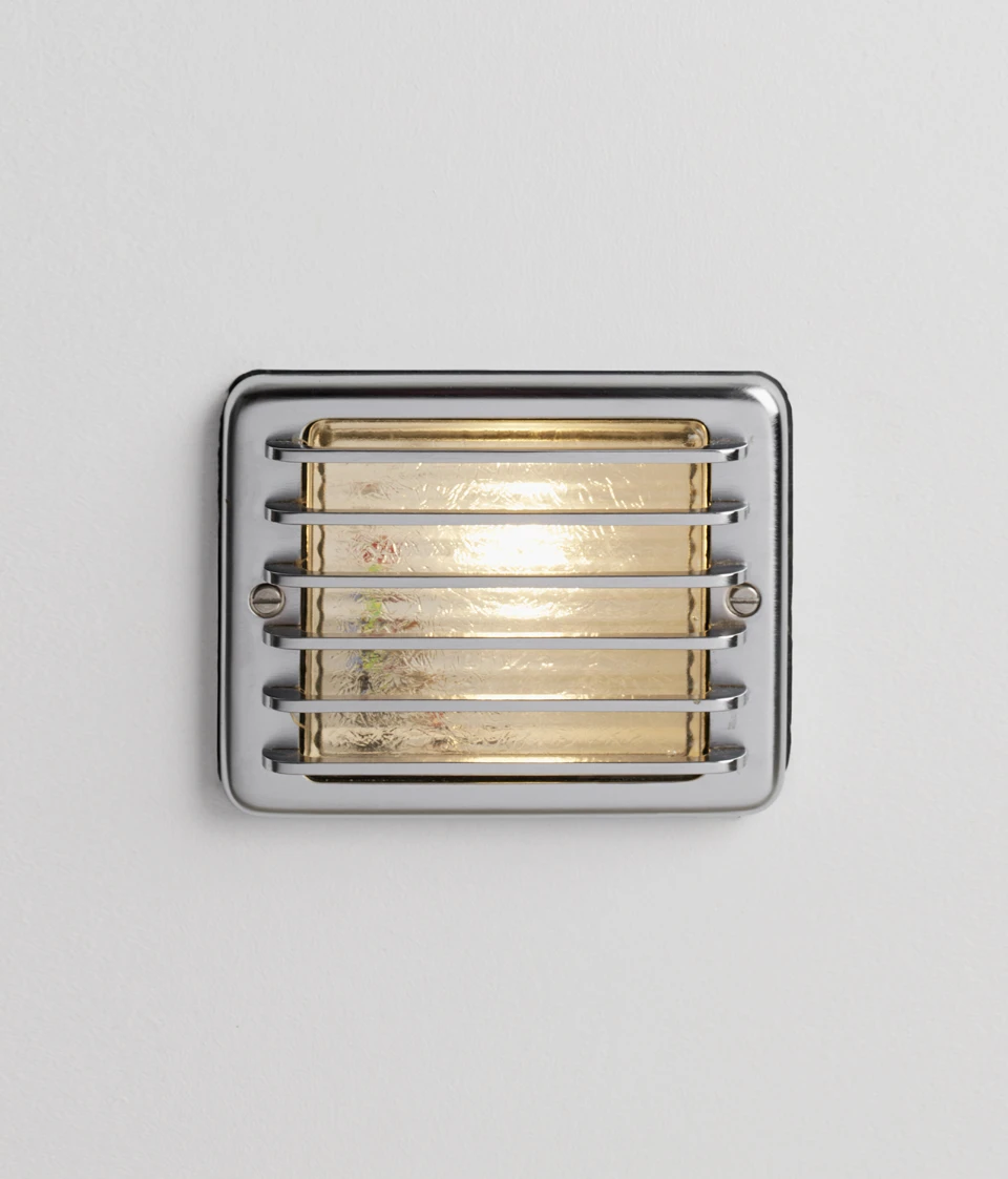 Cette balise d’extérieur Steplight en métal chromé est étanche niveau IP54. Elle est solidement construite en bronze moulé insensible à la corrosion. Elle est conçue pour un usage durable. Ces balises sont particulièrement adaptées à l’éclairage d’un escalier ou d’un lieu de passage. Cette balise doit être encastrée dans une cavité dont les dimensions figurent ci-dessous. Elle est équipée de LED fournissent également un éclairage puissant, qui équivaut à une ampoule halogène de 10W environ, grâce à l’utilisation de LED à haut rendement. Equipée d’un transformateur intégré, elle se connecte directement sur le secteur: il n’est pas besoin de prévoir un transformateur extérieur. Nautic utilise des LED de bonne qualité, et veille à une intégration parfaite dans le luminaire, qui assure un fonctionnement impeccable pendant de très nombreuses années. Grâce à sa faible consommation, cette balise peut être laissée allumée en permanence pour plus de sécurité et de confort. Cette balise existe également en bronze poli sous la référence 11060201 et en bronze patiné sous la référence 11060202.