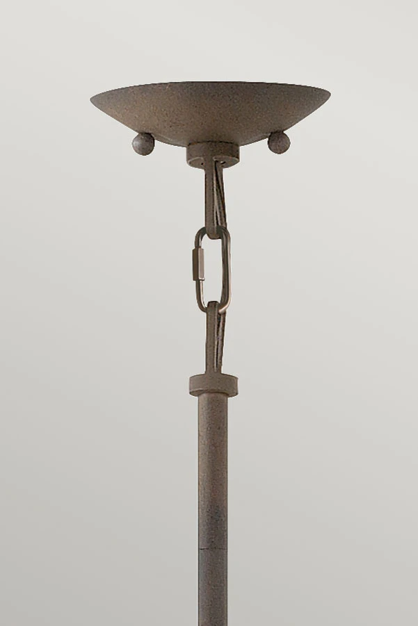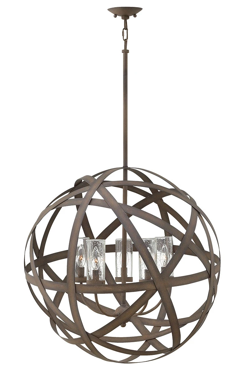 Superbe suspension boule d’extérieur Carson 5 lumières, un audacieux entremêlement de rubans métalliques en forme de sphère en métal rouillé, verre grainé et protection IP44. Carson se présente sous la forme d’une sphère de rubans métalliques, à l’intérieur de laquelle se trouvent les cinq lumières chacune dans un diffuseur cylindrique en verre grainé, montés sur bras à 90° autour d’une boule de métal. Le tout est suspendu par une tige à un support de plafond rond légèrement bombé. La protection IP44 garanti une résistance aux conditions extérieurs dans la durée, tant de la pluie, du froid que du sel ou du vent. Impeccable collection d’extérieur de la maison britannique Elstead Lighting, connue depuis le XVIIème siècle comme les forges Elstead, aujourd’hui alliant la perpétuation des techniques artisanales à une véritable modernité dans le design et la réalisation.