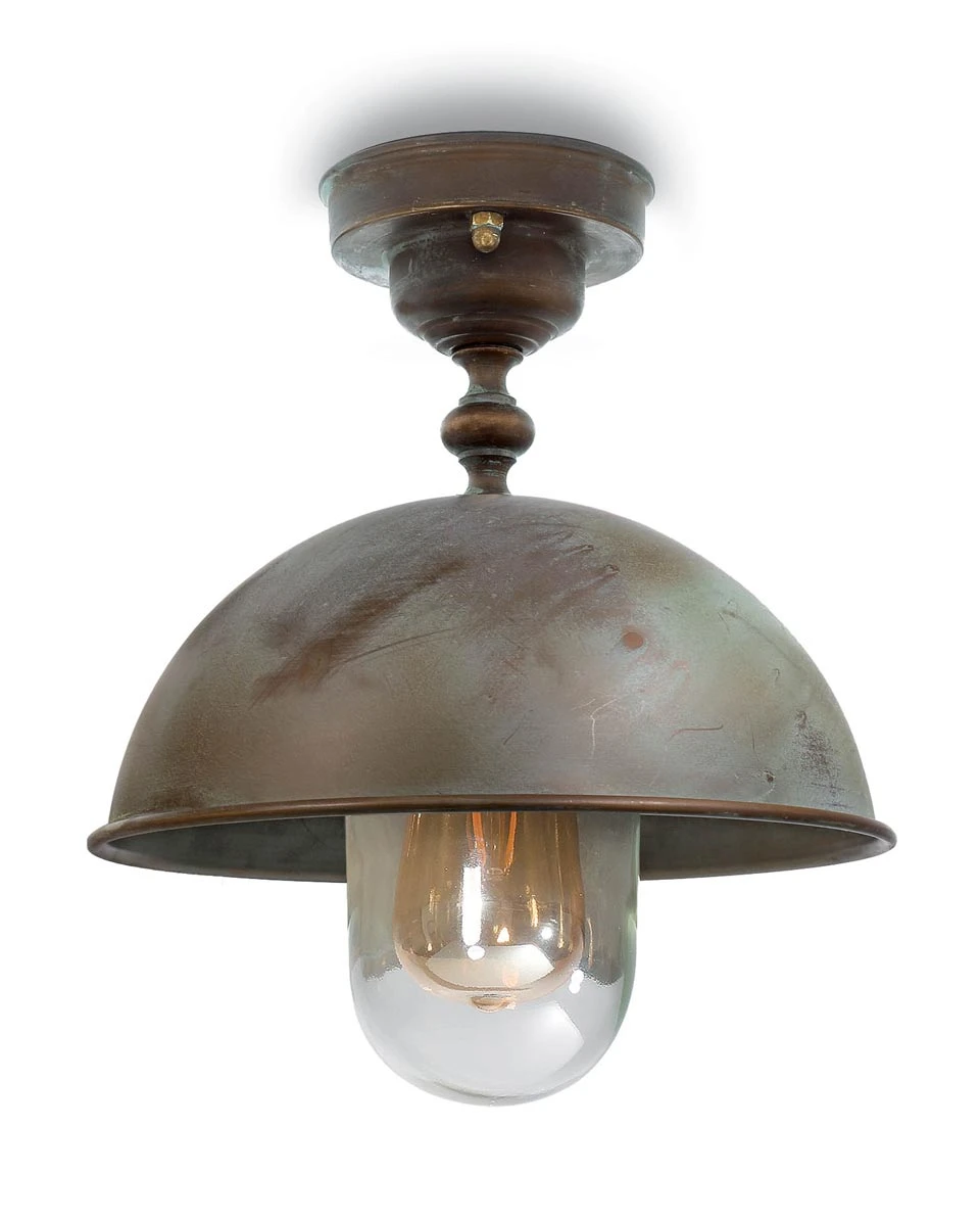 Le plafonnier de la collection mi-vintage mi-industriel Circle est doté de la protection IP44 et est entièrement réalisé en laiton finition vieilli, il est composé d’un support de plafond rond, d’un bras court moulé, d’un abat-jour en cloche ronde et d’un diffuseur cloche en verre transparent dans lequel est insérée l’ampoule. La finition laiton vieilli confère une patine authentique au modèle avec ses touches de vert-de-gris qui insistent sur l’inspiration vintage du modèle. L’utilisation d’un laiton massif d’excellente qualité par la maison italienne Moretti, combiné à la protection IP44, en fait un modèle d’extérieur idéal et résistants aux intempéries, à l’action corrosive du sel en bord de mer et du froid en montagne.