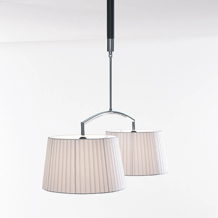 Sur cette page figure le lustre à deux lumières de la série Contrast Wengé, en bois teinté sombre. La collection Contrast Wengé se distingue par l’usage du bois massif teinté couleur wengé, les formes sont anoblies par des détails en métal chromé. Les abat-jour sont réalisés en tissu plissé blanc. La gamme Contrast Wengé se compose d’une applique simple, une applique double, une applique triple, un plafonnier, deux suspensions, un lustre 2 lumières, deux lampes et un lampadaire.