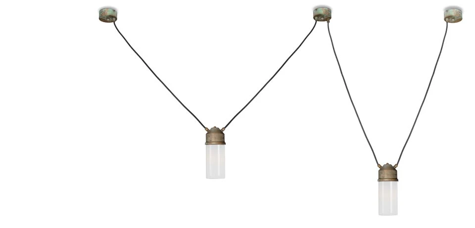 L’élégante et vintage Cubic3, avec une touche industrielle, est le modèle de suspension d’extérieur idéal à disposer en série, avec sa hauteur réglable et sa protection IP44. La suspension est composée d’un support de plafond rond en laiton doté d’une superbe finition vieilli qui produit cette patine authentique parcourue de touches de vert-de-gris, et l’ampoule glissée dans un diffuseur cylindrique en verre opale est suspendu grâce à un jeu de câble. L’applique permet de disposer plusieurs supports de plafond, doté d’un ou deux passages de câble, qui permettent de créer ce jeu d’enchainement de la suspension, comme une enfilade de lanternes suspendues au milieu d’un fil. L’utilisation d’un laiton massif d’excellente qualité par la maison italienne Moretti, combiné à la protection IP44, en fait un modèle d’extérieur idéal et résistants aux intempéries, à l’action corrosive du sel en bord de mer et du froid en montagne. Pour des guirlandes de 3 à 10 lumières, nous consulter.
