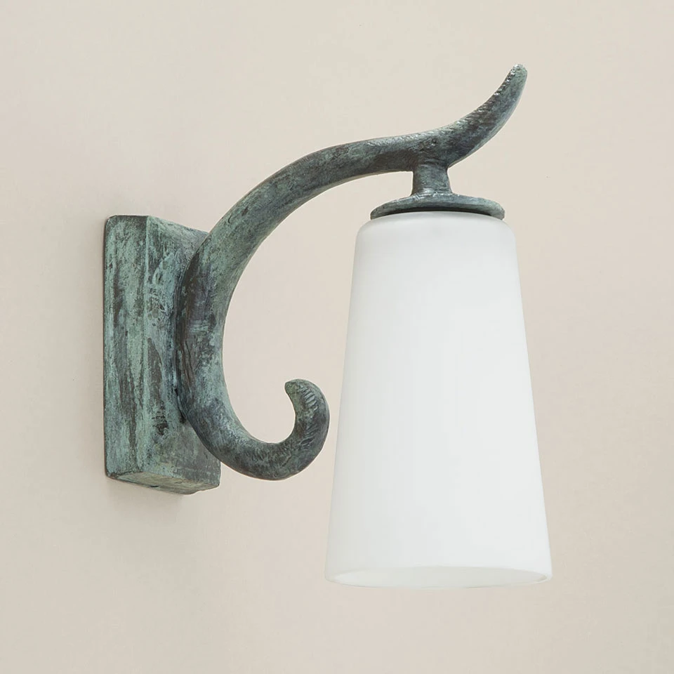 Delia séduit par son design simple et élégant, un design de lanterne classique pour un travail en bronze massif vert patiné et abat-jour de verre opale blanc. Le modèle est doté d’un support mural rectangulaire vertical, surmonté d’un bras courbé qui évoque une corne, sur lequel est fixé l’abat-jour légèrement conique en verre blanc. Ce modèle de petite taille trouvera également sa place dans une salle de bain. Le bronze massif dont l’applique est faite est travaillé d’une belle finition verte qui donne cette patine vert-de gris au modèle, et magnifie la puissance du matériau tout en lui laissant un léger aspect rugueux, avec des irrégularités qui font la dimension unique du modèle. Objet Insolite est une maison française qui crée des luminaires au sein de ses ateliers normands depuis 1981, et qui bénéficie du label Entreprise du Patrimoine Vivant, distinction accordée par l’état qui reconnait les entreprises françaises à la production artisanale et industrielle d’exception. Ce modèle est IP23 pour un usage en extérieur ou dans une salle de bain.