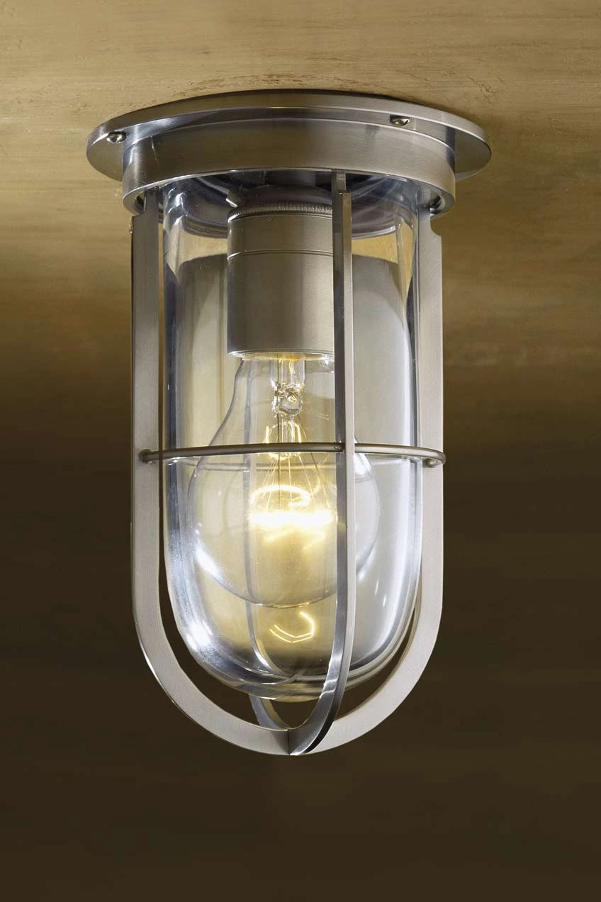 Docklight Ceiling est une série de plafonniers de belles dimensions, fabriqués en bronze massif. Ces plafonniers sont constitués d’un support magnifiquement usiné de 12.5cm de diamètre fixé au plafond par trois vis assorties. S’insèrent dans ce support la verrerie cylindrique dont l’extrémité est arrondie et la grille de fixation en bronze qui entoure et protège le verre. L’ampoule est placée dans une douille assortie au corps de la lampe. Les plafonniers de la série Ceiling sont disponibles en bronze nickelé mat, en bronze antique, en bronze chromé, en bronze nickelé mat et en bronze nickelé poli. Chaque modèle est disponible avec une verrerie transparente ou avec une verrerie sablée faisant diffuseur. Dans le cas d’une verrerie transparente, il est recommandé d’utiliser l’ampoule décorative de navigation conçue par Nautic disponible au rayon accessoires. Construits aux normes IP44 dans des matériaux insensibles à la corrosion, les plafonniers Ceiling sont conçus pour fonctionner durablement à l’extérieur.
