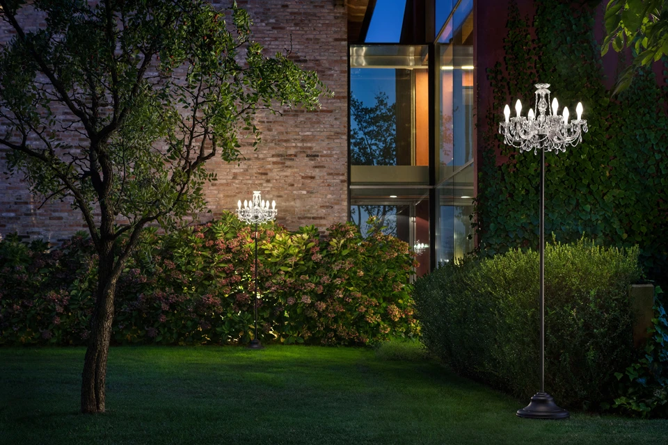 Imaginez ce magnifique lampadaire en forme de lustre 6 lumières fait d’acrylique transparente et perché sur un pied en polycarbonate illuminant votre jardin, il est issue de la gamme Drylight qui nait de la volonté d’associer la superbe du lustre vénitien à la résistance aux conditions extérieurs corrosives, tant le sel, la pluie, que le froid ou les UV, d’où la protection IP65 des luminaires, combinée aux dernières innovations technologiques qui permettent un éclairage LED blanc ou RGBW activable par télécommande pour ce dernier, par application sur smartphone ou directement relié au système domotique du lieu. Le lampadaire est composé d’un socle en cloche pensé pour être fixé au sol, surmonté d’un pied en tube de polycarbonate noir droit couronné de ce superbe lustre vénitien doté de 6 bras en en demi-cercle fixés sur un enfilage central rond discret en polycarbonate, les bras sont chacun dotés d’un bassin en coupole délicatement façonnée en corolle de fleur et décorée de pampilles d’acrylique qui créé un effet de prisme. Les bassins sont surmontés d’ampoules allongées qui imitent la forme de bougies et qui accueillent les modules LED d’une température de couleur de 3000K pour ce modèle (blanc), et les bras sont reliés entre eux par de délicates chaines de verre qui s’entremêlement et étoffent le luminaire. Le module LED RGBW, abréviation anglaise de rouge, vert, bleu, blanc, permet par la combinaison de ces couleurs de créer une lumière de la couleur qui vous sied et façonner l’éclairage à souhait. La maison italienne Masiero réalise un parfait mariage entre l’esthétique vénitienne classique et la créativité permise par les innovations technologiques, pour une collection élégante et pléthorique.
