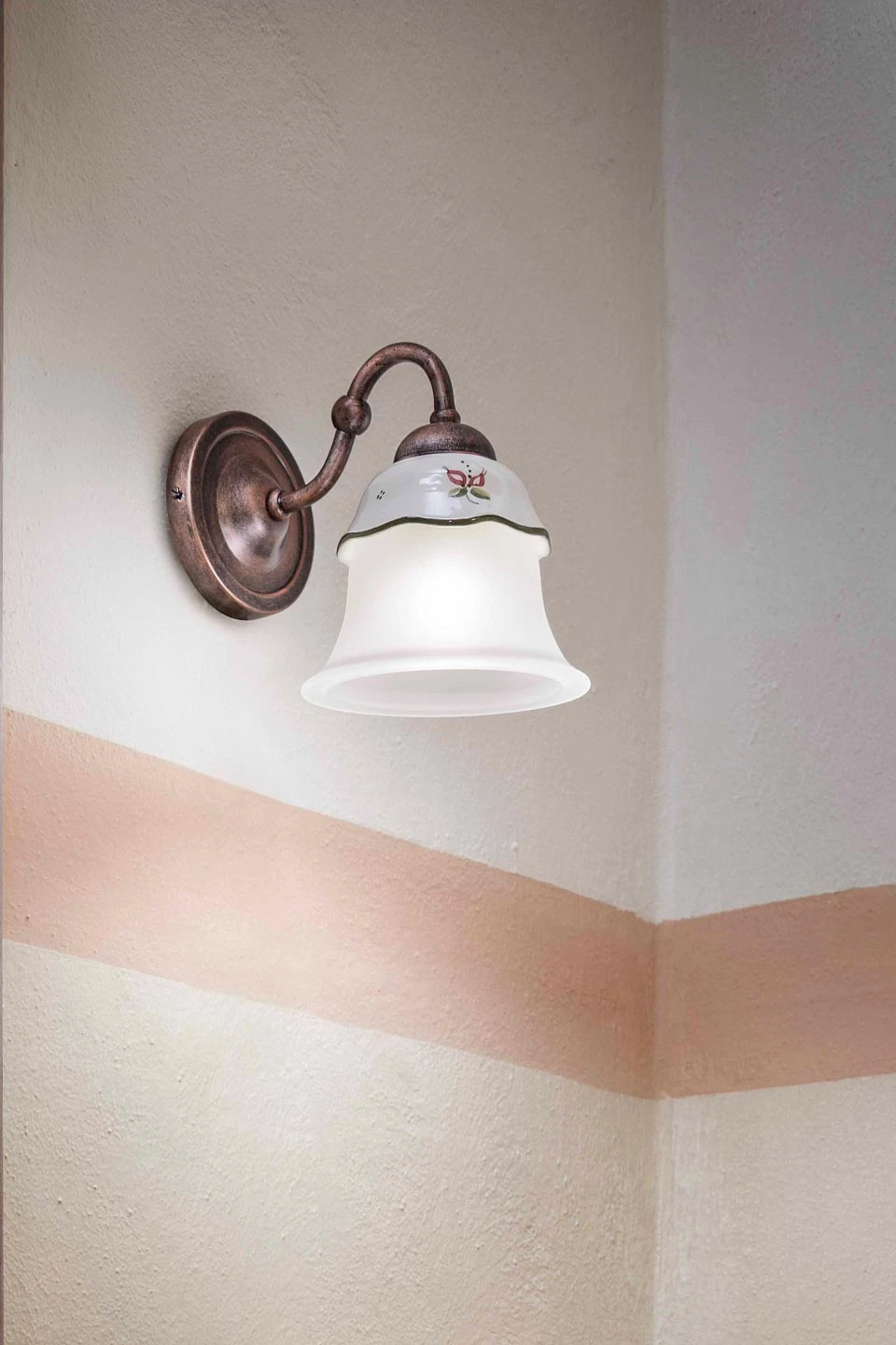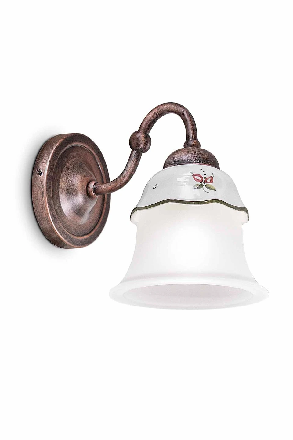 Petite applique simple Ferrara au charme campagne désuet, avec son abat-jour en cloche formée d’une partie inférieure de verre satiné blanc et un capuchon de céramique dont le bord ondulé est rehaussé d’un liseré vert et parsemé de petites fleurs rouges et vertes. L’abat-jour est fixé sur un bras en col de cygne et relié à un support mural rond, réalisés en métal avec une superbe finition cuivre noir qui donne cette patine unique au modèle. Sentez l’atmosphère ensoleillée de la campagne Romagne à travers la collection Ferrara, qui puise son inspiration dans l’esthétique patinée de ses cottages rustiques du début du 20ème siècle. La maison italienne Ferroluce, en activité depuis 1982, fabrique ses luminaires exclusivement en Italie, aux mains des meilleurs artisans céramistes.