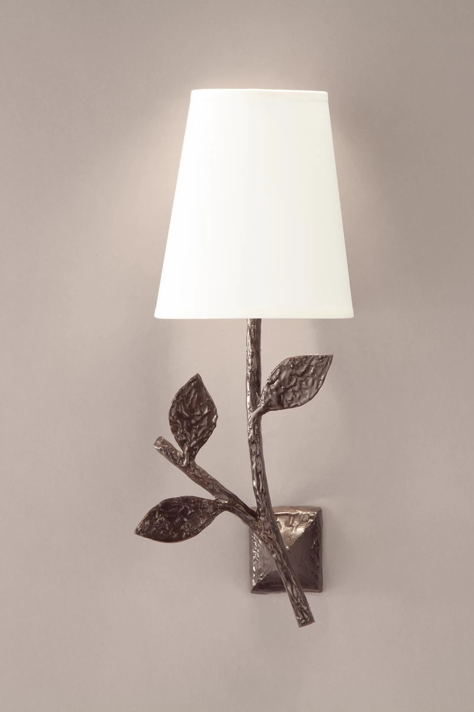 Avec la délicatesse de l’inspiration végétale et la force d’un matériau noble, le bronze, l’applique deux lumières de la collection Flora s’inscrit dans le style classique et organique de la maison Objet Insolite. Le bras figure une jeune branche parsemée de feuilles qui se sépare en deux. La texture irrégulière du bronze renforce l’aspect naturel du luminaire, celle-ci est le résultat de la technique de moulage d’inspiration industrielle qui fait de chaque luminaire un modèle unique. La finition patinée du bronze que vous voyez ici est obtenue grâce à une oxydation à chaud du bronze, qui est ensuite teinté et ciré. L’abat-jour conique est en taffetas blanc. Objet Insolite est une maison française qui crée des luminaires au sein de ses ateliers normands depuis 1981, et qui bénéficie du label Entreprise du Patrimoine Vivant, distinction accordée par l’état qui reconnait les entreprises françaises à la production artisanale et industrielle d’excellence.