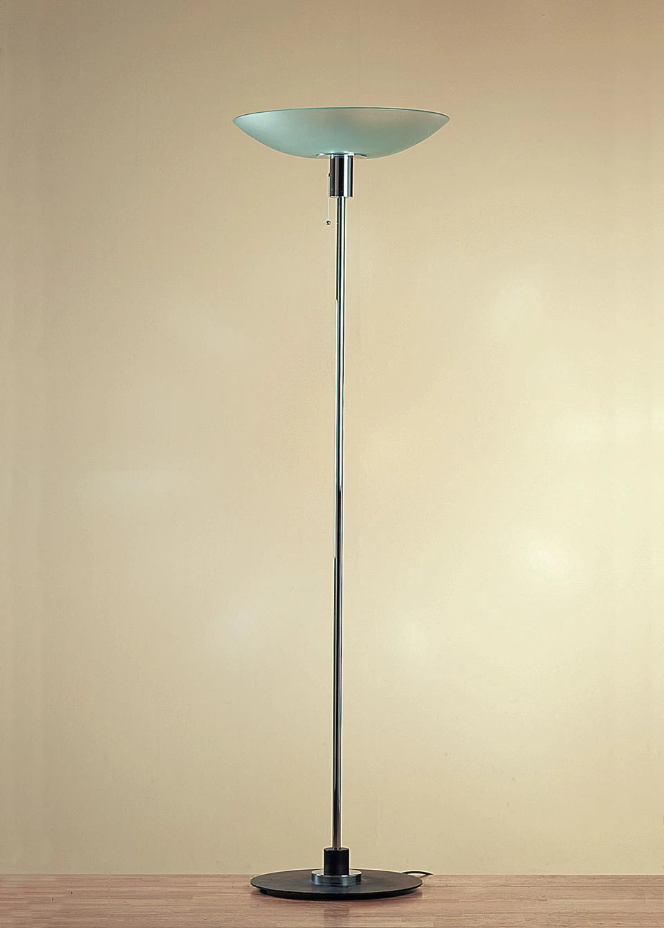 Ce lampadaire de la maison Contract&More fait partie de leur collection rétro. C’est un long tube de métal chromé sur un socle circulaire en acier laqué noir, le tout coiffé d’un réflecteur en vasque, fait de verre dépoli dans des tons légèrement vert-bleuté. L’interrupteur est une courte chaine métallique près de la douille, sous l’abat-jour.