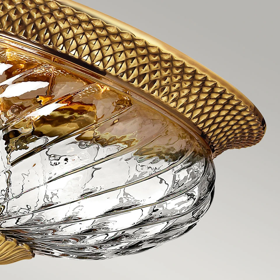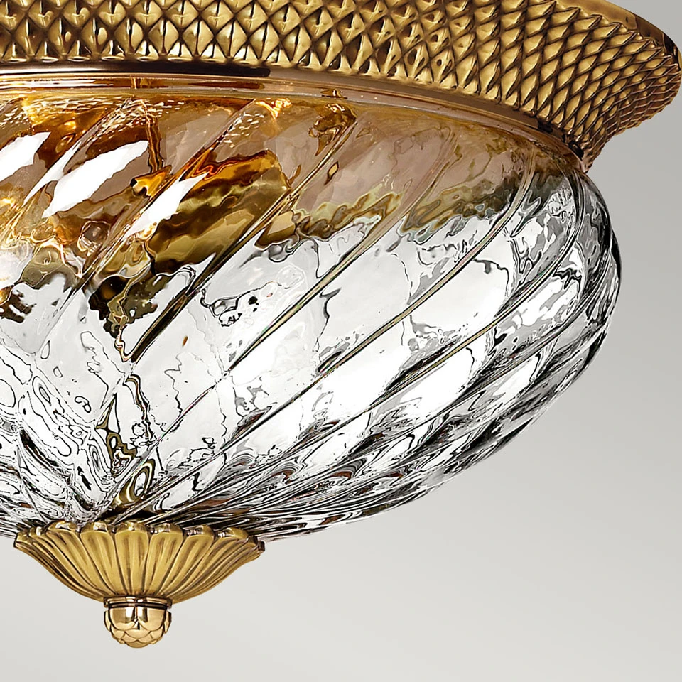 Ravissant grand plafonnier doré de la collection Art Nouveau Plantation, inspirée du dessin géométrique de l’ananas, tout en verre optique et métal finition laiton bruni. Le modèle est composé d’un support de plafond rond moulé d’un motif en losange en relief imitant la peau du fruit exotique, surmonté d’un dôme de verre optique marqué de légères spirales qui suggèrent de nouveau le motif en losange, le tout couronnée par une petite fleur dorée, et doté d’une élégante finition laiton bruni qui confère une patine authentique au modèle. L’impeccable fabrication est celle de la maison britannique Elstead lighting, connue depuis le XVIIème siècle comme les forges Elstead, aujourd’hui alliant la perpétuation des techniques artisanales à une véritable modernité dans le design et la réalisation.