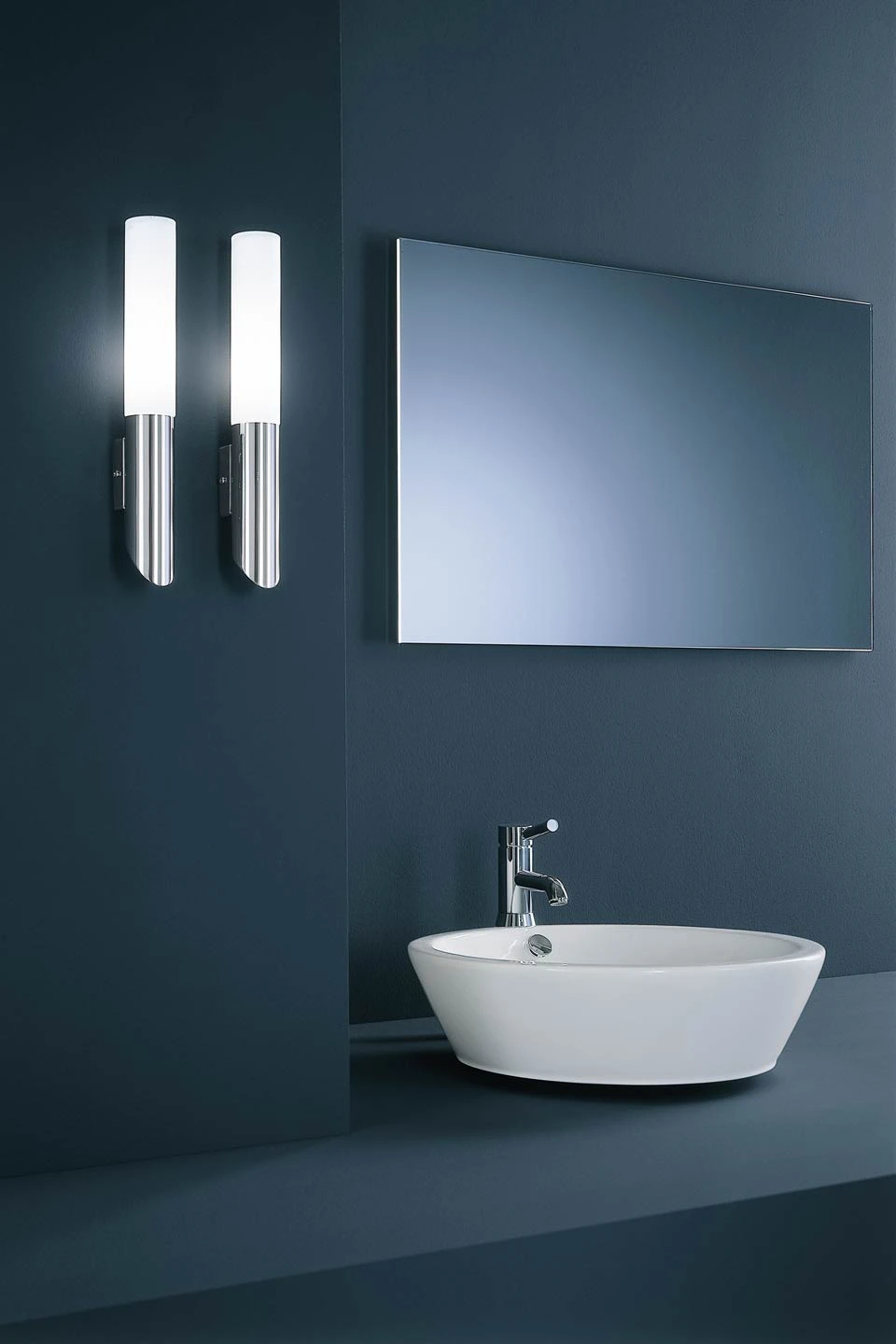 Cylindrique, cette grande applique de salle de bains est réalisée en chrome et en verre dépoli. Le support mural, rectangulaire, est caché par la partie verticale en forme de cylindre. Celle-ci se décompose entre une partie inférieure biseautée en métal chromé, et une partie supérieure constituant le diffuseur en verre dépoli. Le diffuseur abrite une ampoule à vis standard. L’emploi d’une ampoule LED 3000°K permet d’obtenir une meilleure restitution des couleurs, ce qui est particulièrement utile dans une salle de bains. Fabrication particulièrement soignée dans les ateliers de Baulmann Leuchten en Allemagne. Etanche norme IP44.