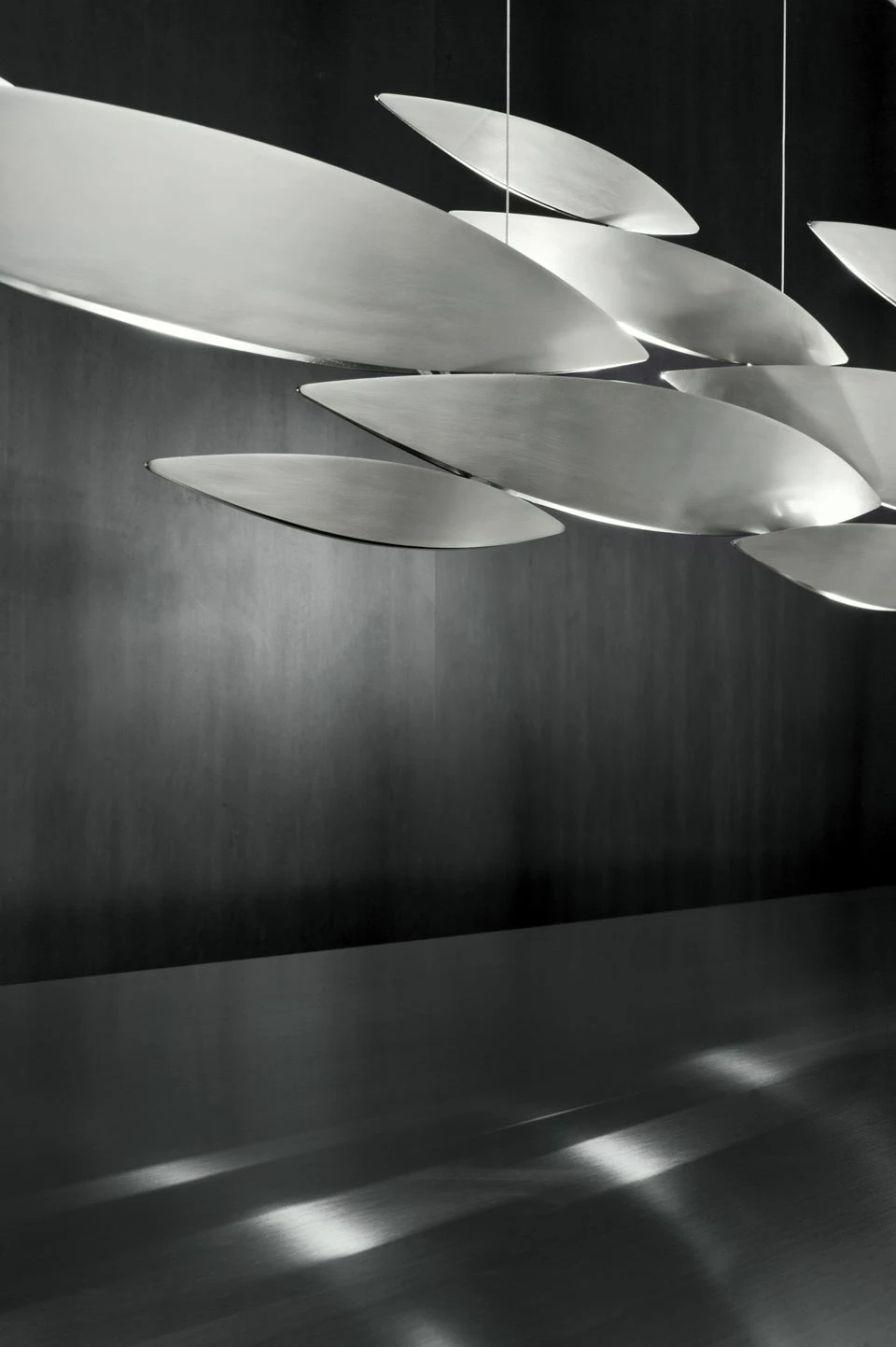 I Lucci est une délicieuse évocation de la mer, toute en courbes harmonieuses, modernes et épurées. Le lustre 145cm est composée de pièces allongées de nickel brossé qui forment comme un banc de ce qui pourrait être d’abstraits poissons argentés. Le modèle, suspendu par 3 discrets câbles métalliques, est soulignée par les modules LED intégrés. Le boitier d’alimentation au plafond est rectangulaire et en métal assorti. Les modules LED fournissent un éclairage très puissant et de très belle qualité, à connecter sur un variateur 1-10V ou PWN.