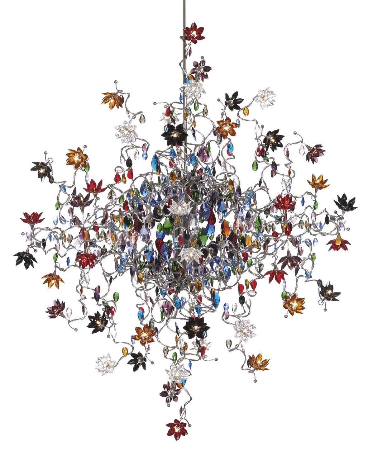 Le somptueux Lustre Jewel 48 lumières en verre multicolore, est tout en fleurs de verre teinté et fil d’acier. Les gammes Jewel et Jewel Diamond sont en fil d’acier inox de 2 et 3mm et entièrement faites à la main.
