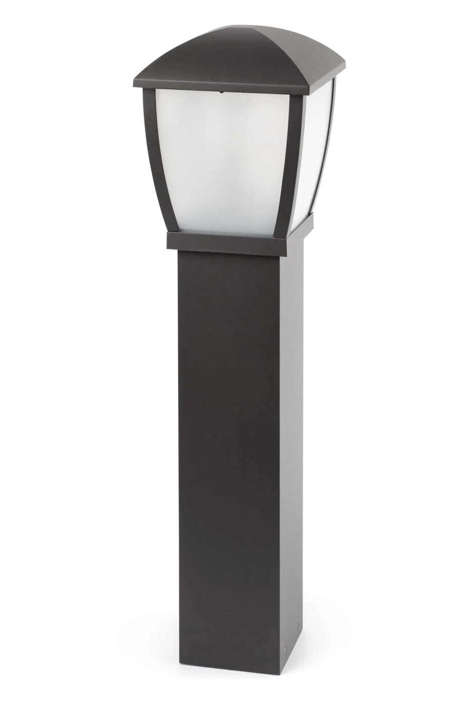 Ce lampadaire balise de jardin en lanterne aux formes incurvées est idéal pour une installation au sol ou sur un élément de maçonnerie. Avec une hauteur de 82cm, ce luminaire fournit un éclairage efficace sous un format discret. Solidement construit en aluminium gris foncé, il est surmonté d’un élégant dos arrondi formant toit – qui fournit une excellente protection contre les chocs. Quatre éléments d’angle retiennent et protègent le diffuseur dépoli réalisé en polymère de synthèse. Le pied permet une fixation facile sur tout support horizontal. Ce lampadaire de jardin peut être équipée d’une ampoule d’une puissance maximale de 100W. Le diffuseur, par ses qualités de filtrage de la lumière, permet l’utilisation d’une ampoule à basse consommation fluocompacte. Construite aux normes d’étanchéité IP44, ce luminaire est adapté à un usage à l’extérieur.