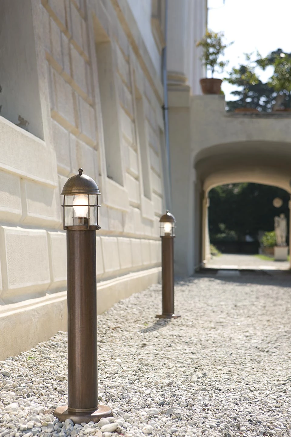 Les formes de ce lampadaire de jardin rappellent celles d’une lanterne de phare, avec un verre cylindrique protégé par une grille et un sommet hémisphérique. La lanterne est placée au sommet d’une solide colonne, reliée à un support rond. Ce lampadaire de jardin est disponible en trois tailles, 40cm, 80cm et 120cm, pour lesquelles seule la hauteur de la colonne varie (les dimensions du socle et de la lanterne restent constante). C’est le lampadaire de 80cm qui est représenté sur la photographie principale figurant sur cette page. La réalisation est menée de façon traditionnelle dans les ateliers de Trévise du fabricant. Ce lampadaire est étanche, il est conforme aux normes IP44. On peut, si on le souhaite, commander au même prix avec une verrerie dépolie, qui permet d’utiliser une ampoule LED en préservant un résultat esthétique plaisant. Ce lampadaire peut également être commandé en version à piquer. Dans ce cas le socle est remplacé par une lame de 28cm à enfoncer dans le sol. Des deux modifications peuvent nous être précisées par email au moment de votre commande. Il existe enfin une très belle applique assortie sous la référence 12120044.