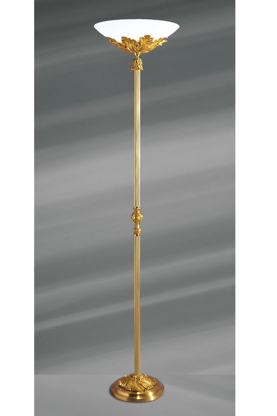 Equipé d’un diffuseur en verre dépoli, ce lampadaire doré Louis XV en bronze concilie impératifs techniques, exigences de style et fabrication exemplaire. Son diffuseur en verre dépoli permet d’émettre à l’horizontale une excellente lumière d’ambiance parfaitement homogénéisée, et vers le haut un fort éclairage non diffusé. Pour minimiser l’impact de cette entorse au style Louis XV, le diffuseur est enchâssé dans un support en feuilles de bronze finement découpées. Le pied de ce lampadaire est décoré de cannelures et d’un ornement en forme de boule, et s’élargit à son extrémité inférieure en un support massif et stable, également décoré de feuilles assorties. Ce lampadaire est capable de recevoir une ampoule halogène de 300W. La qualité de fabrication est remarquable. Le bronze, massif, est patiné vieil or. Il existe un modèle similaire, équipé d’un réflecteur en bronze, sous la référence 120202350. Un autre lampadaire XV, avec quelques variantes ornementales, et également équipé d’un diffuseur en verre dépoli, est visible sous la référence 12020275.