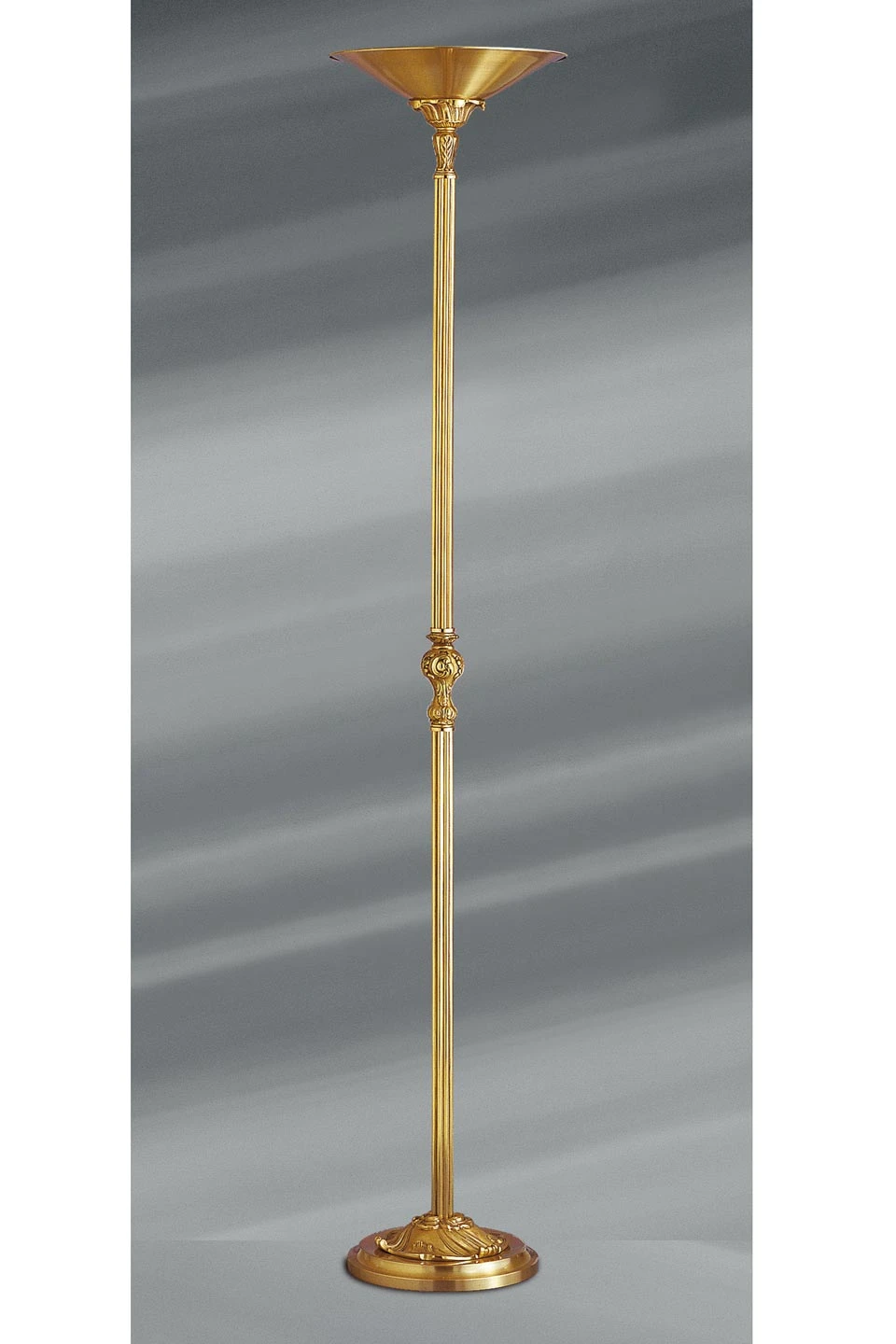 Equipé d’un réflecteur en bronze, ce lampadaire doré Louis XV en bronze émet vers le plafond un fort éclairage. Ce réflecteur prend la forme d’un simple cône renversé en bronze, décoré de quelques ornements à sa pointe et équipé d’une rotule pour l’orienter. Le pied de ce lampadaire est décoré de cannelures et d’un ornement en forme de boule, et s’élargit à son extrémité inférieure en un support massif et stable, également décoré de feuilles assorties. Ce lampadaire est capable de recevoir une ampoule halogène de 300W. La qualité de fabrication est remarquable. Le bronze, massif, est patiné vieil or. Il existe un modèle au dessin très proche sous la référence 12020264. En outre, un modèle similaire, équipé d’un réflecteur en verre dépoli, est visible sous la référence 120202349.