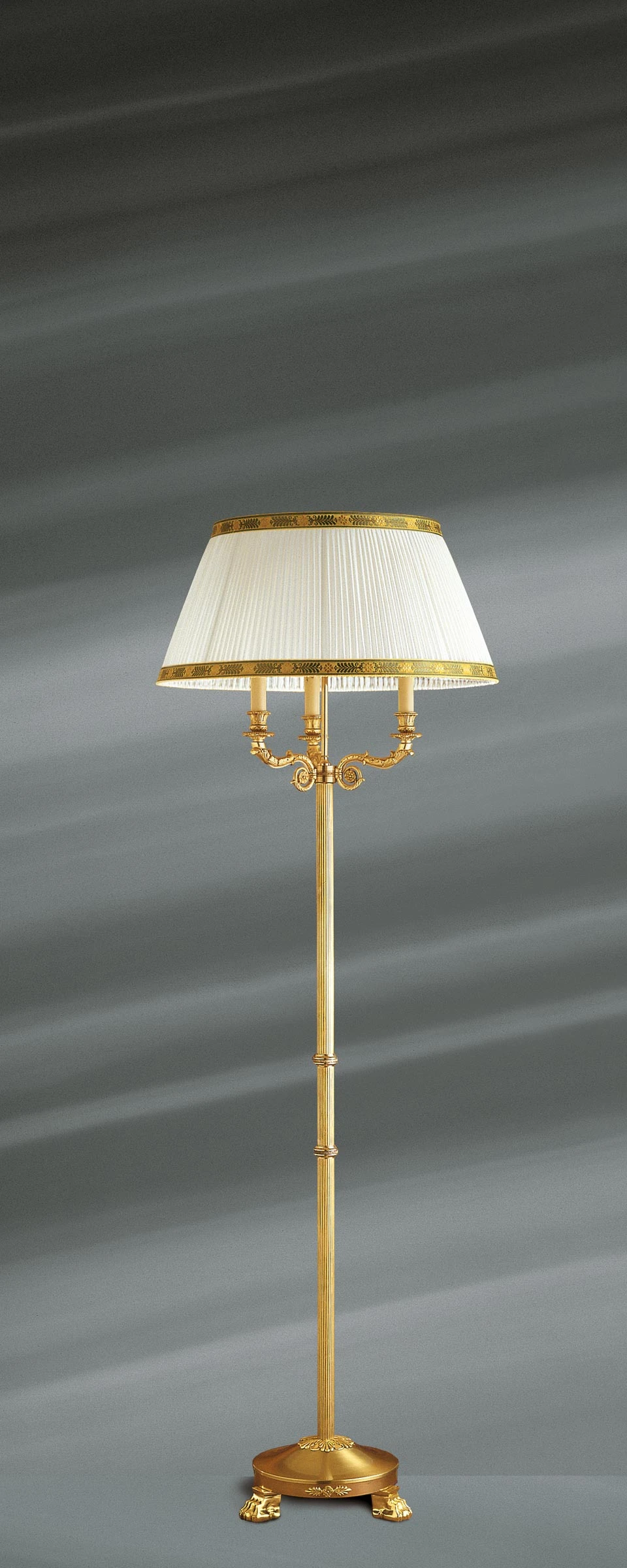 Pureté et élégance qualifie ce très raffiné lampadaire en bronze massif de style Empire à trois lumières, terminé par un abat-jour blanc plissé. Son socle en forme de bouclier poli repose sur des pieds de lion d’où part un long pied cannelé dont la longueur est sectionnée par deux séries d’anneaux. Le pied, en son extrémité supérieure, porte trois bras en volute portant lumières, à la courbure soulignée par des feuilles d’acanthes. Ses bassins et bobèches sont délicatement sculptés et décorés. ils soutiennent des bougies cachées pour partie par un superbe abat-jour blanc plissé orné, haut et bas, par des frises vivement dorées. Ce lampadaire est le fruit d’un travail exceptionnel, celui des artisans de la maison Lucien Gau, bronzier d’art depuis six génération.