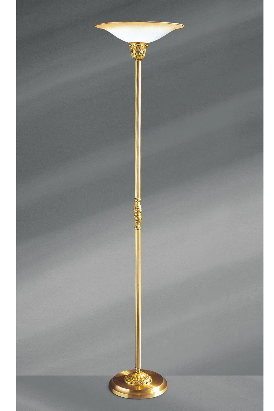 Equipé d’un diffuseur en verre dépoli en forme de vasque et placé au dessus d’un support décoré, ce lampadaire doré fournit un puissant éclairage, tout en respectant les règles du style Louis XV. Son diffuseur en verre dépoli permet d’émettre à l’horizontale une excellente lumière d’ambiance parfaitement homogénéisée, et vers le haut un fort éclairage non diffusé. Le diffuseur est posé sur une rotule qui permet l’orientation de la vasque. Pour minimiser l’impact de cette entorse au style Louis XV, le diffuseur est placé au-dessus d’un support en bronze orné de feuilles finement découpées. Le pied de ce lampadaire est décoré de cannelures et d’un ornement double en son centre, et s’élargit à son extrémité inférieure en un support massif et stable, également décoré de feuilles assorties. Ce lampadaire est capable de recevoir une ampoule halogène de 300W. La qualité de fabrication est remarquable. Le bronze, massif, est patiné vieil or. Il existe un modèle similaire, équipé d’un réflecteur en bronze, sous la référence 120202364. Un autre lampadaire XV, avec quelques variantes ornementales, et également équipé d’un diffuseur en verre dépoli, est visible sous la référence 12020249.