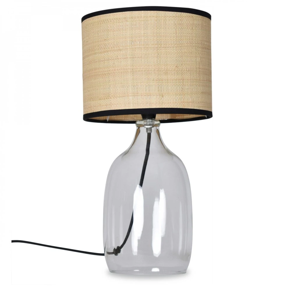 Matière : verre transparent pour la base et abat-jour en raphia naturel