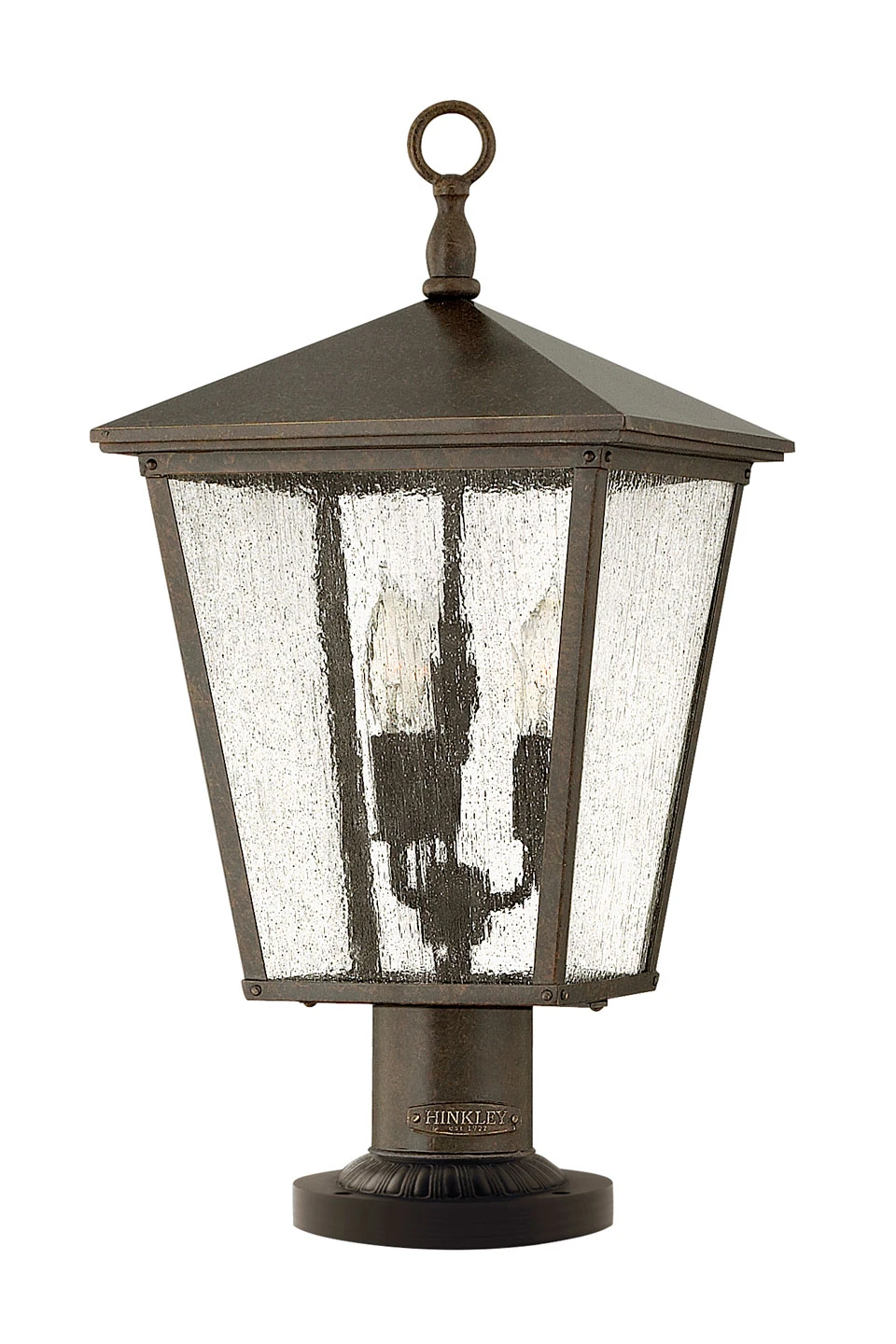 Jolie lampe d’extérieur 3 lumières de la collection Trellis, dont le style est inspiré de l’esthétique des lanternes traditionnelles, avec structure en métal finition bronze, verre grainé et protection IP44. Le modèle est doté d’un socle rond et d’un court pied cylindrique sur lequel est posée la lanterne, légèrement conique et de format carré, avec son vitrage en verre grainé et sa finition bronze. La lanterne et surmonté d’un anneau et est équipé de protection IP44 qui garantit la résistance de l’applique aux conditions extérieures et intempéries.