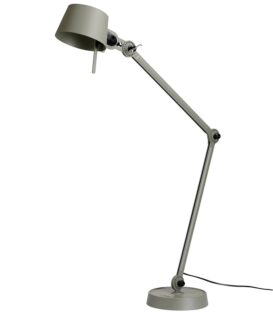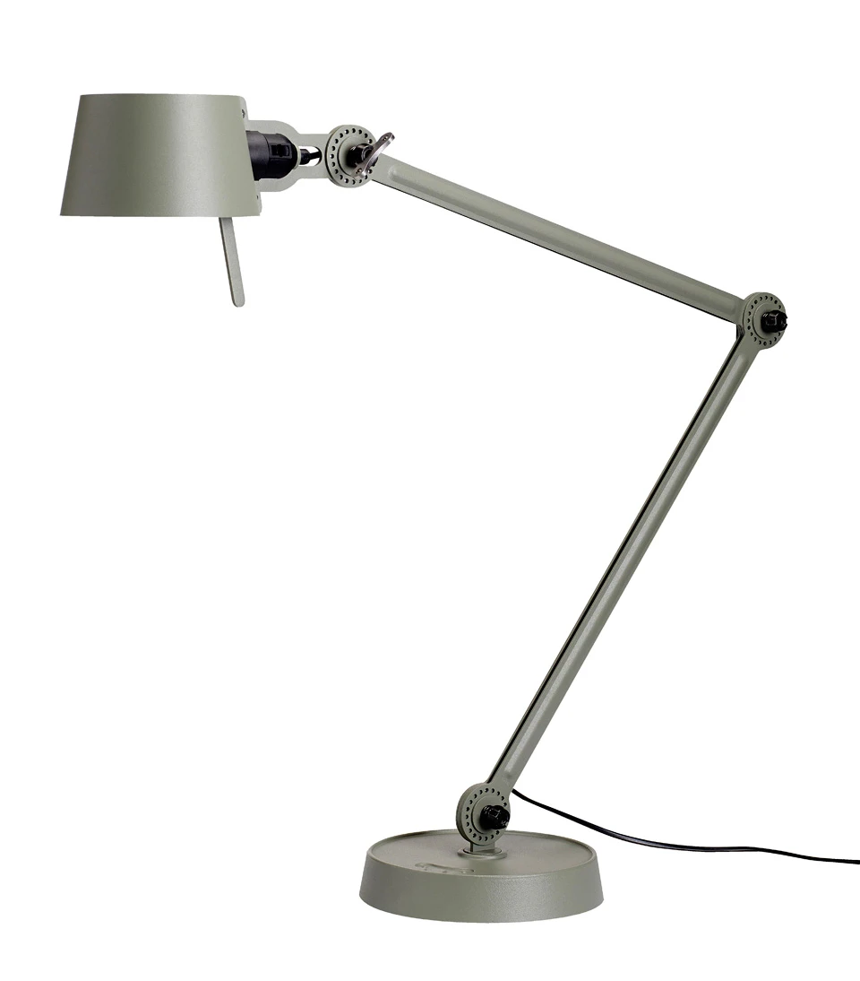 La lampe de bureau style atelier Bolt Desk en métal vert mousse dispose comme ses soeurs de deux bras articulés aux rotules crantées et fixées par un bel outil papillon réglable. La finition du métal est mate et légèrement grainée pour accentuer l’aspect massif et industriel de la lampe. Elle est composée de deux longs bras reliés par des rotules qui permettent un réglage précis et en trois dimensions (horizontal, vertical et rotation) et d’un réflecteur orientable à l’aide d’une poignée sur le côté. Le socle circulaire en acier massif est très stable. La lampe est livrée avec un très bel outil papillon siglé avec la marque TONONE et chaque lampe est numérotée. Bolt est une collection complète de 22 lampes dessinées par le designer néerlandais Anton de Groof. Les lampes TONONE se distinguent par leur design soigné, la densité de leurs éléments en acier et en aluminium (8 kg pour ce modèle) et leurs très belles finitions. Elles sont entièrement fabriquées à la main au Pays Bas par des artisans hautement qualifiés. La gamme Bolt est déclinée en 7 couleurs mates, par exemple en noir sous la référence 17090101, en bleu sous la référence 17090102, en orange sous la référence 17090103, en écru sous la référence 17090105 et en blanc sous la référence 17090106. D’autres modèles proposent différentes combinaisons de bras, de modes de fixation et de tailles. L’outil papillon est argenté par défaut, mais disponible également à la demande en noir, cuivre, ou doré