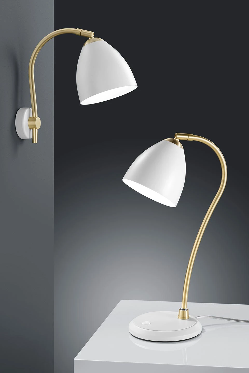 Un très beau travail et un design classique pour cette lampe de table blanche et laiton satiné. Elle se compose d’une tige courbe en métal doré et d’un diffuseur laqué blanc mat. Celui-ci est inclinable et en forme de tulipe et présente un intérieur blanc. Son socle rond, également en laiton mat blanc, est muni d’un interrupteur. Le fil d’alimentation électrique est blanc. Ce luminaire, fabriqué dans les ateliers Baulmann Leuchten en Allemagne bénéficie d’une réalisation très soignée. Orientable à votre guise, il assurera un éclairage parfait dans votre intérieur et conviendra à tout style. Existe également en laiton mat noir sous la référence 16010107.