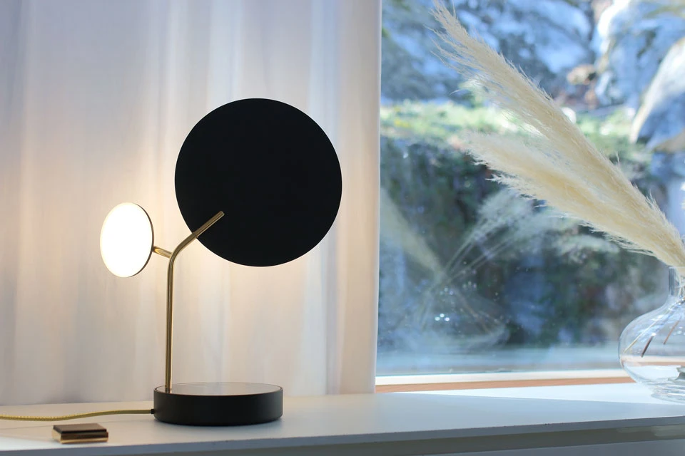 Laissez-vous séduire par le raffinement, l’élégance et le design scandinave épuré de la lampe de table Ballon, collection détentrice du prix German Design de 2019, avec ici le modèle doré et noir en acier, et éclairage LED intégré. Le modèle est composé d’un socle en marbre noir veiné de blanc et cerclé de métal laqué noir, surmonté d’un pied doré 24 Carat en « Y » dont chaque extrémité est équipée d’une tête lumineuse métallique orientable à 330°, l’une est un disque noir de 11cm de diamètre, l’autre est un disque de 25cm de diamètre, chacun doté d’un panneau LED ultra-mince. La lampe Ballon, sophistiquée et versatile, excellente lampe de bureau ou de chevet, est équipé d’un câble d’alimentation gainé doré.