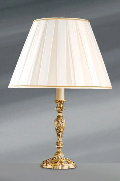 Cette lampe dorée de style Louis XV est formée d’un bougeoir unique placé au sommet d’un pied en bronze massif, patiné doré. Différents motifs ornementaux, de style Louis XV, décorent cette lampe. Ils sont réalisés au moment du moulage de la lampe, puis affinés et ciselés à la main. Un abat-jour complète cet ensemble, en tissu plissé blanc à larges plis, souligné de deux fins galons dorés. La fabrication, d’une exceptionnelle qualité, est réalisée par les artisans d’art employés par Lucien Gau, en n’employant que les méthodes les plus traditionnelles, et en totalité en France. Il existe une lampe au dessin similaire, de plus grande taille, sous la référence 12020242.