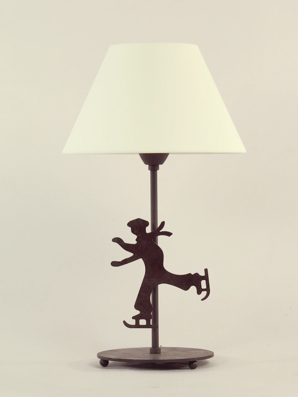 Une lampe de table ludique de la collection Montagne, avec sa silhouette de petit patineur qui chevauche la tige et le pied circulaire, en métal à l’aspect rouillé. L’abat-jour simple qui surmonte la structure en métal patiné est en cotonette blanc.Ce modèle est également disponible avec un abat-jour décor sapin dans les options de commande au bas de cette page. La lampe offre une atmosphère chaleureuse et enfantine, avec sa lumière chaude et son design montagnard. La marque Ryckaert offre une production artisanale et authentique depuis 1947, à partir de matériaux tels que le métal ou le bois, qui sont sculptés et patinés à la main, et nous livrent ainsi des produits uniques. Ryckaert offre des modèles compatibles avec ampoules fluocompactes ou modules LED, dans un souci environnemental.