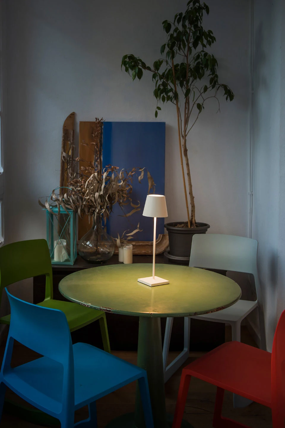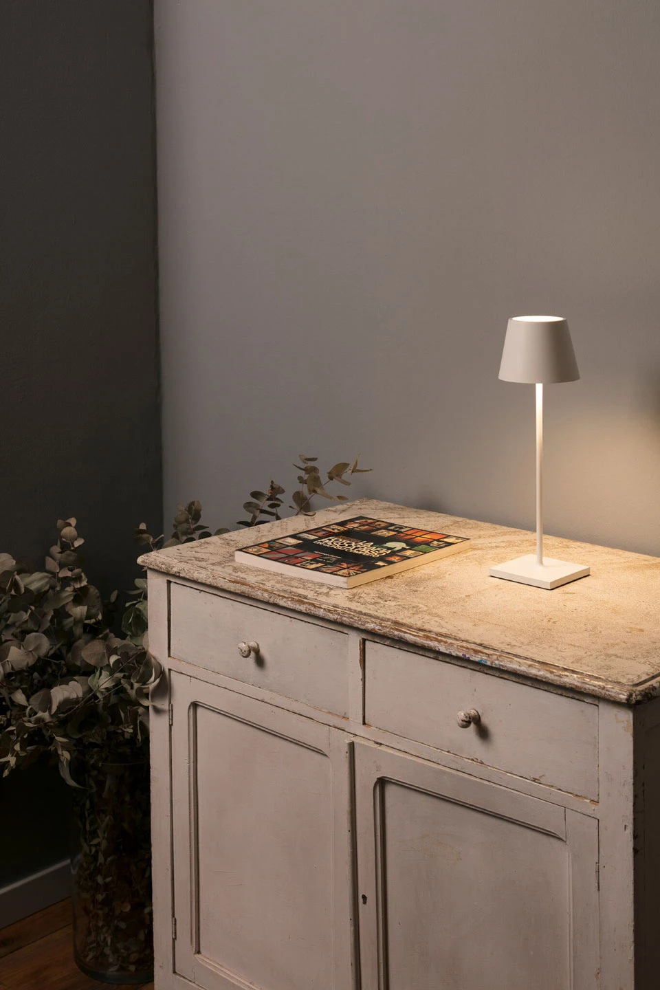 Laissez-vous séduire par la simplicité du modèle Toc380, une lampe portable blanche au design classique revisité dotée de la protection IP54, d’un batterie et d’un variateur de lumière. La lampe en aluminium est faite d’un socle carré surmonté d’un pied et d’un abat-jour conique avec diffuseur en polycarbonate blanc. Pratique et élégante, le modèle intègre une batterie qui bénéficie d’une autonomie de 9h, après une charge de 5h et la lumière provient d’un module LED intégré qui procure une lumière ambiante et qui illuminera vos diners nocturnes en extérieur. Elle s’allume, s’éteint et fait varier l’intensité lumineuse par le système Touch en effleurant le haut de l’abat-jour.