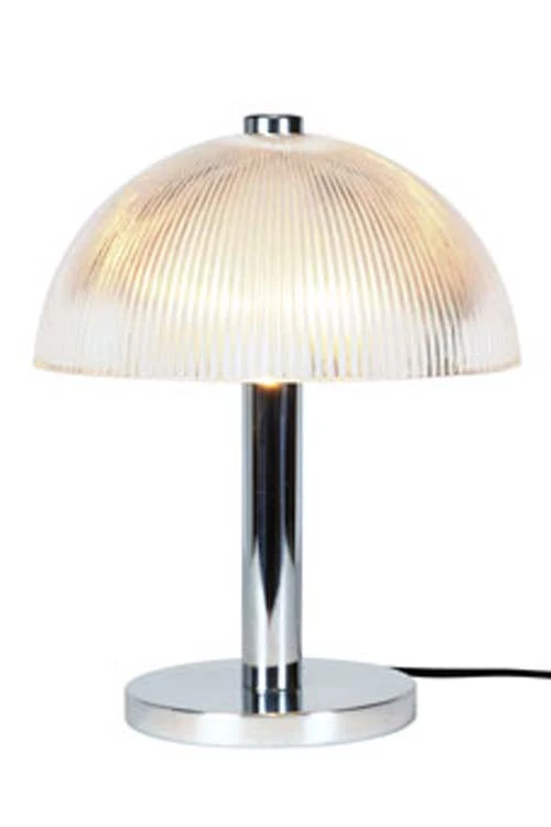La lampe en verre prismatique Cosmo est munie d’un réflecteur en verre épais cannelé, dont les propriétés optiques permettent d’obtenir une lumière claire et non éblouissante. Un très bon équilibre est ainsi obtenu entre la lumière émise en projection directe et l’éclairage diffus qui bénéficie à toute la pièce. Le réflecteur prend la forme d’un hémisphère surmonté d’une pièce en métal cylindrique qui prolonge le pied- pour un effet d’une grande élégance. Le pied de la lampe prend la forme d’un cylindre de métal chromé. La base du pied est également cylindrique, et garantit une excellente stabilité à la lampe. Il existe dans la collection Original BTC plusieurs luminaires (appliques, suspensions, etc.) également munis d’un réflecteur en verre cannelé, ce qui permet de créer un ensemble coordonné d’une grande cohérence esthétique. Pouvant être équipée d’une ampoule halogène de 100W, cette suspension est capable de fournir un éclairage généreux, par exemple pour illuminer une table ou un plan de travail de belles dimensions.