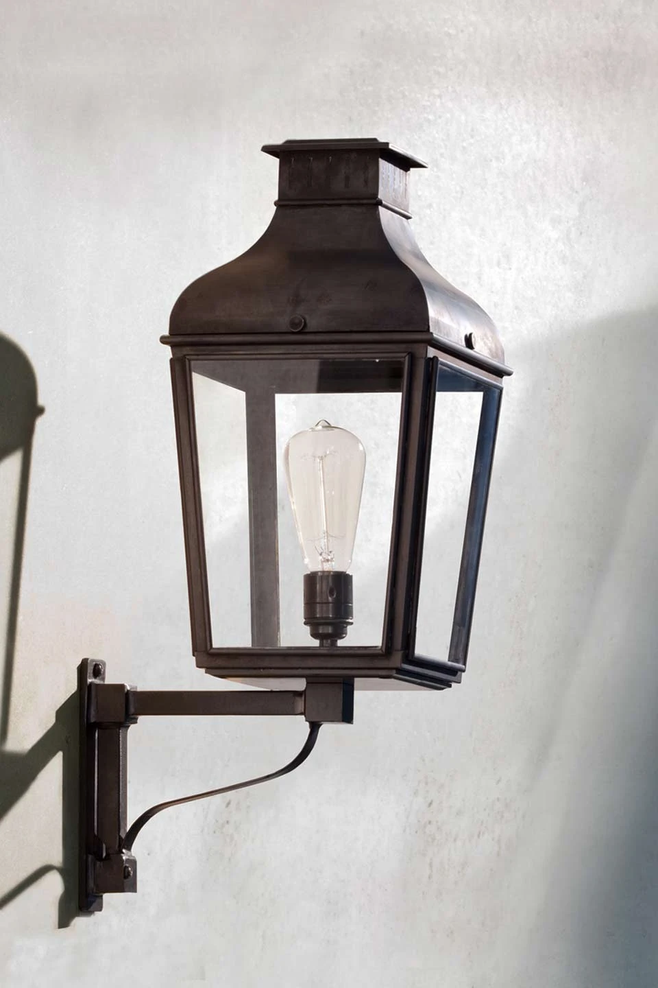 Très belle et dessinée pour les demeures les plus prestigieuses, cette lanterne est conçue pour une pose en applique sur mur extérieur. Elle est réalisée en bronze vieilli par l’application d’une patine sombre – un procédé appelé bronze antique. Rigoureusement construite aux normes d’étanchéité IP43, cette lanterne est conçue pour un usage extérieur. Elle est constituée d’un corps de lampe en bronze, fixé sur un bras support en fer forgé. Cette lanterne prend toute sa dimension esthétique lorsqu’elle est munie de l’ampoule décorative crée par Nautic, version modernisée de l’ancienne ampoule à incandescence. Avec un surplomb de 30cm, cette lanterne est également adaptée aux balcons étroits, et ne constitue pas un obstacle au passage.