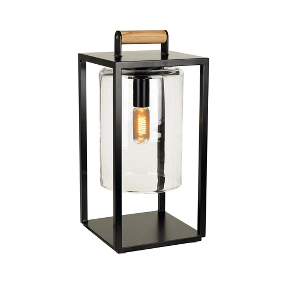 Cette très belle lanterne d’extérieur de forme rectangulaire est en aluminium noir époxy et en verre clair. L’ampoule est logée dans un verre de forme cylindrique. La structure est composée de quatre pieds reliant le socle et une plaque, l’ensemble de forme carrée. Elle se transporte facilement grâce à sa poignée en bois rond fixée sur le haut. Le long fil d’alimentation de 4,50m permet un branchement facile et l’ampoule à filament de carbone apporte un éclairage chaleureux. Ce luminaire de classe IP43 est réalisé avec le plus grand soin et avec des matériaux de qualité et se raccorde directement au secteur 230V sans nécessiter de transformateur.