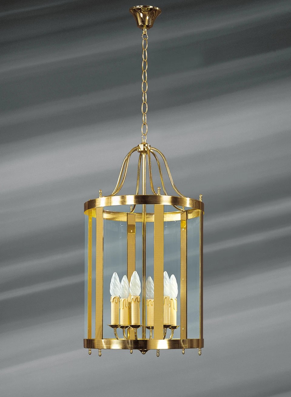 Beauté et sobriété caractérisent cette lanterne en bronze massif parfaitement polie et en verre bombé. La qualité de ses matériaux entièrement fabriqués à la main garantissent le meilleur éclat de la lumière diffusée par ses six bougies. Le verre de cette lanterne est soutenu par deux cercles en bronze massif lisses et éclatants en ses extrémités. Six lamelles de bronze supportent le verre et se fixent sur les cercles métalliques. Une tige centrale soutien les six bras du luminaires et les relient au point d’ancrage de la chaine. Celle-ci est formée de maillons simples à qui le polissage donne un éclat sans pareil.